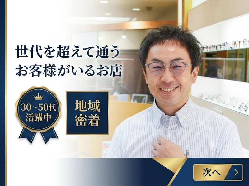 求めている人材 • 接客・販売・営業の経験を、形を変えてもう一度活かしたい方 • 結婚・出産・介護などでブランクがあるが、現場に戻ることを検討している方 • 「売る」よりも、「お客様と一緒に選ぶ」プロセスを大切にしたい方 • 相手の話を最後まで聞き、状況を整理して提案することが得意な方 • 地域に根ざした仕事を通じて、顔なじみのお客様と長く関わっていきたい方 • 落ち着いた空間で、腰を据えて働ける職場を探している方 【応募条件】 • 未経験OK(眼鏡知識不要) • 接客・販売経験があれば歓迎(アパレル・雑貨など) • 人と話すことが好きな方 • 学び続ける姿勢をお持ちの方 • 地域に根ざして働きたい方
