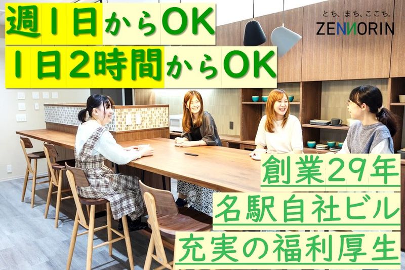 【仕事内容】 週1日からOK!1日2時間からOK!(もちろん、週5日のフルタイムもOKです) 名古屋駅から徒歩圏内の新しいオフィスの不動産・建築会社のパート・一般事務募集。 2022年6月に建築した名駅本社ビルでの勤務です。 ブランクある方歓迎!異業種からの転職歓迎!不動産や建築業界からの転職ももちろん大歓迎です! ■具体的な仕事内容 パソコンスキルや文章力、コミュニケーションスキルを活かした事務全般をお任せいたします。 ・契約書や提案資料、その他書類の作成 ※Word・Excelを使用した書類作成(主に既成のフォーマットを使用) ※営業が接客したお客様への手紙の作成など ・ホームページやブログ・SNSの更新 ※当社ホームページの更新(分譲地情報や採用情報などの新着ニュースの更新など) ※当社ブログ「全農林ジャーナル」の更新 ・電話対応や来客応接 ※ホームページや広告などからお問合せいただいたお客様の電話応対や来客応接 ※内覧会にご来場いただいたお客様へお茶の給仕などの接客対応 など ●全農林について 全農林は1996年6月創業、“みなさまの信頼と安心のパートナーとなる”をモットーに、 総合不動産デベロッパーとして宅地分譲事業および戸建住宅・ビルなどの賃貸・住宅事業を愛知県・岐阜県を中心に展開しています。 世代を越えて「ここが私たちの地元」と呼べる街を、地域の皆様と一緒に創っています。 創業以来順調に業績を伸ばし、2022年6月名古屋駅に本社ビル(自社ビル)を建築しました。 先輩スタッフは業界未経験からスタートしている方もたくさんいます。 お家づくりは営業や現場監督、職人さんだけではできません。 それを裏で支えてくれる、土地を仕入れる人や見積もりを作る人、設計をする人など様々な方の協力があって、出来上がります。 住宅は一生に一度と言われるお買いもの。 お客様は30代40代の方が多く、その方々に楽しく気持ちよく、滞りないように打ち合わせ、お引き渡しできるようサポートしてほしいと思っています。 一生に一度のお家づくりを「事務」という立場で支えてくれる人を募集しています。 まずはお話し聞いてみませんか? ご応募お待ちしております。 【求人ID-ZR3】