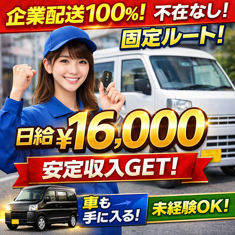 仕事内容: 毎日決まった時間で働けて ✨しっかり定時で帰れる✨ ✅ 勤務時間は8:00~18:00固定 ✅ 定時上がりでプライベート充実 ✅ 企業配送で不在ほぼなし ✅ 固定ルートで覚えやすい ✅ 希望エリアで勤務可能 ◤ ̄ ̄ ̄ ̄ ̄ ̄ ̄ ̄ ̄ ̄ ̄ ̄ ̄ ̄ ̄ ̄ ̄◥ ✨「安定×働きやすさ」重視の方へ✨ ◣_________________◢ 【仕事内容】 企業向けの荷物を固定ルートで配送します。 ▶ここがポイント ・企業配送だから再配達ほぼなし ・時間に追われず配送できる ・毎日同じルートで安心 【1日の流れ】 ①倉庫で荷物の積み込み ⬇ ②決まったルートで配送 ⬇ ③18:00前後で業務終了 ➡ ほぼ毎日定時で帰れます✨ 未経験でもすぐ慣れるシンプルな業務です この仕事の魅力!!! ・生活リズムが安定する ・無理なく長く働ける ・プライベートの時間も確保 ➡「稼ぎすぎなくていいから安定したい」方に最適 ✨他社と違うポイント✨ ✅ 希望エリアで勤務可能 ➡ 通いやすいエリアで働ける ✅ 紹介制度あり ➡ 仲間を紹介して収入アップ ✅ 車両レンタル・譲渡制度あり ➡ 車がなくてもスタートOK ➡ 継続で自分の車に