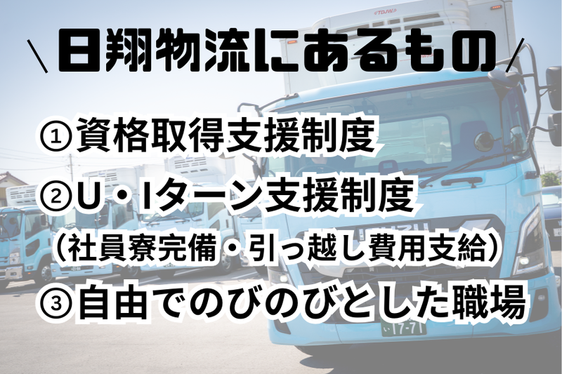 お仕事内容 ■手積み手おろしほぼなしで無理なく仕事を続けられる! 台車やカゴ車を使って荷物を運ぶので、ブランクがある方も安心して働けます。 ■最大年収500万円可能! 賞与年2回・昇給ありで給与が安定しています。 ■社員寮あり!U・Iターンも応援! 一人暮らしを始める方の生活も会社がサポートします! 【仕事内容】 4tトラックで食品(サンドイッチ・お弁当・飲料など)を配送します。 ===== 〇配送エリア:県内や関東エリア中心 〇配送件数:1日3~5か所 〇積み下ろし:手積み・手おろしほぼなし(台車・カゴ車使用) ===== 【こんな方におすすめ】 ■運転経験を活かしたい ■最後の転職にしたい ■無理のない働き方で長く安定して働きたい 1つでも当てはまる方は、お気軽にご応募ください! 【電話・LINE応募も受付中】 ◎LINE:https://lin.ee/aeIGDyQ (24時間対応可能!) ◎TEL:045-924-1511(平日8:00~17:00) LINEで採用担当者に直接質問できます! 「日翔物流」でLINE検索!ぜひ友達追加してください♪ もちろん電話でのご質問も可能です!お気軽にご相談ください♪
