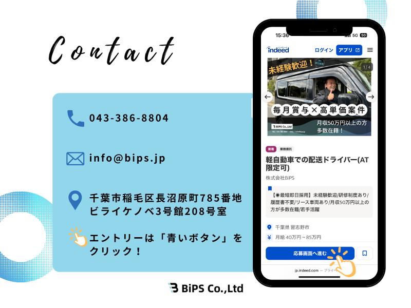 アピールポイント: ✅未経験でも安心の育成制度を完備! 社員・先輩ドライバーが、 つきっきりで研修サポートいたします! 助け合いの社風があり、 独り立ち後もお任せ下さい! ▼研修内容 Day1:横乗り研修 先輩ドライバーの横乗りをし、 一日の流れや仕事内容を確認。 荷物の積み方、配達ノウハウやコツ等、 お伝えいたします。 Day2~Day5:実務研修 自分で積込~運転~配達を実施。 実際に業務をして出てきた疑問や不安を、 先輩ドライバーに聞きながら解決出来ます。 ✅事故や車両トラブルも即解決! ・黒ナンバー代車あり ・自社レッカー車保有 ・自動車整備工場あり(提携先) ・自動車板金工場あり(提携先) 万が一の事故や車両トラブルもご安心ください! 仕事を止めることなく、 ガンガン稼ぐことが可能です! ✅BiPS独自の特別制度を導入! ▼業績評価制度 一定の配達品質を達成した方へ 毎月賞与を支給! ※昇給、社員雇用制度あり。 ▼独立支援制度 ・経営者になりたい! ・より高い収入が欲しい! ・自分を成長させたい! 将来を見据えたキャリア設計が出来る 制度も完備しております! ----------------------------