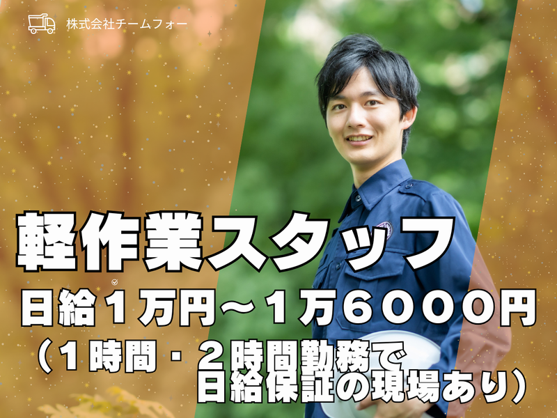 仕事内容 <ポイント> ◆平日の1日平均勤務4時間/25年8月 ◆最大日勤の日給1万6000円! オフィス用品・荷物の搬入・移転作業やオフィスのレイアウト変更をする仕事。 色々な仕事を用意していますので5年10年と長期勤務も可能! ポジション変更可 <新人研修> 半日/資材の名前・養生の仕方等現場に行く前に基礎を教えます。 ■未経験には基礎的な知識・業務内容を個々に研修を行います。 未経験の方も安心に仕事が出来るように指導を徹底しています。 ・HPに仕事内容など動画で見ることが出来ます。 <勤務地は> 渋谷、新宿、東京、西日暮里、上野、秋葉原、 池袋、有楽町、丸の内、銀座、日比谷、新橋、 大手町、御茶ノ水などの都内23区内に多数! ◇直行直帰◇★首都圏・駅チカ 有名な大型オフィスビル多数!! 現場に直行して作業が終わり次第直帰になります。 駅チカの現場が多いので移動も便利ですよ! ・HPに仕事内容など動画で見ることが出来ます。 興味がある方は是非HPをご覧ください。 http://www.team-for.co.jp/