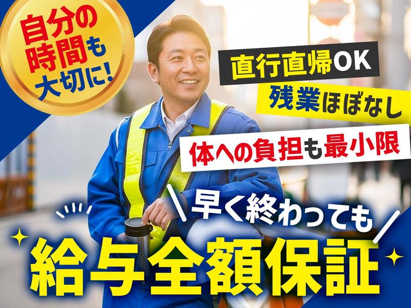 勤務時間詳細 実働時間:1日あたり8時間 平均勤務日数:1ヶ月あたり18日 〜 22日 8:00~17:00(休憩60分) ※現場により前後あり・小休止推奨 ※直行直帰OK◎ ※残業ほぼなし! ★早上がりの現場も多く、その場合でも日額保障があります♪