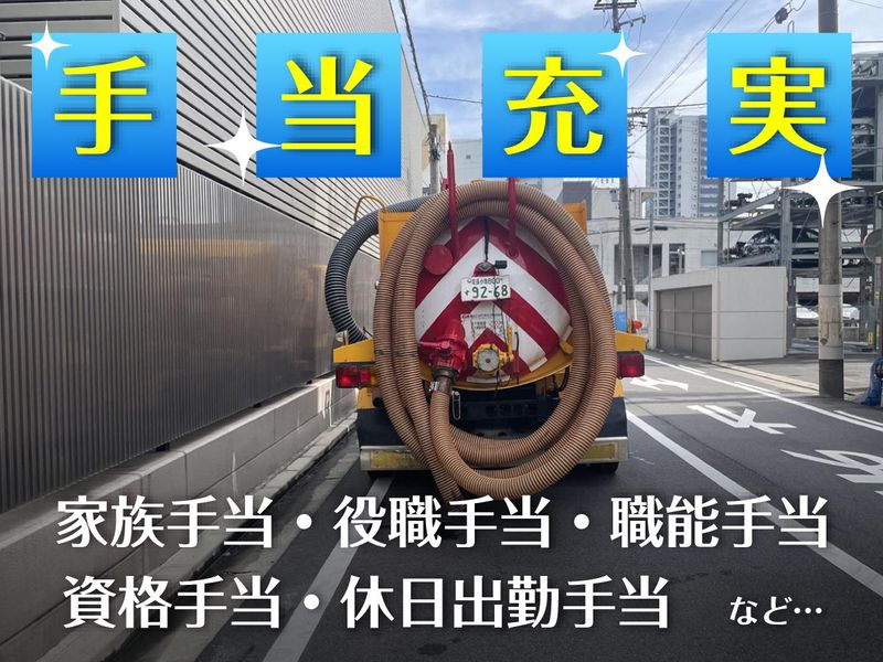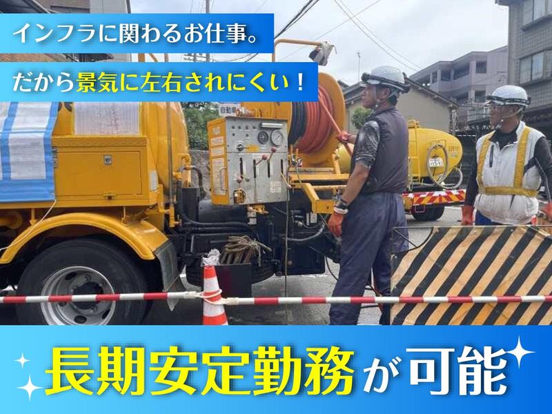 仕事内容 ***このお仕事のおすすめPoint!*** ■公共インフラに関わるお仕事だから、 景気に左右されにくく安定した仕事量。 長~く安定して働くことが可能! ■中型免許や大型免許、 土木施工管理技士などの資格も 制度を利用して取得することが可能だから 手に職つけられる! (対象の資格は5~10個あります。) ■土日祝休みでGWやお盆、 年末年始には長期連休あり! 残業も少なめでプライベート充実! ■初めは月給23万円ですが 「もっと稼ぎたい!」という方は 休日出勤も相談OK! 月収30万円稼ぐ、未経験からスタートした 20代の先輩スタッフもいますよ。 あなたのご希望をお聞かせください! <少しでも「いいな」と思っていただけたら まずはお問い合わせください! 職場見学も大歓迎!> ***具体的な仕事内容*** 街中の水が流れているところ(河川、池、 用水路、下水道、排水管、雨水桝など)を キレイにするお仕事です。 「知識もないし、未経験だから不安…」 なんて方もご安心ください! まずはコーンを配置したり、 現場のフォローから始めていきましょう! ***下水管清掃をするときの流れ*** (1)対象の場所に作業車輌を設置 (2)作業エリアをコーンなどの 保安機材で囲む (3)マンホールのフタを開けて清掃スタート (4)洗浄車のホースを投入し、高圧洗浄 (5)下水道管内の土砂などの異物を 吸引車で吸い上げ (6)蓋を閉め、機材を片付け、次の現場へ