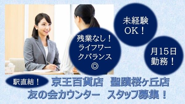 仕事内容 ◆駅チカ好立地! 通勤ストレスなし♪「聖蹟桜ヶ丘駅」直結! ◆服装自由◎オフィスカジュアルOK 着替えの手間なし♪ 私服でそのまま出勤できてラク! ◆ブランクがあっても安心♪ 丁寧な研修あり◎ 久々のお仕事復帰もサポート万全! ◆月15日勤務でプライベートも充実! 家事や趣味との両立もラクラク♪ ◆社員食堂あり! コスパの良い社員食堂が利用できるので、ランチも安心♪ - スマホやパソコンで カンタン WEB登録実施中! - 当社からメールでお送りするURLをクリックするだけで 担当者とビデオ通話スタート! ※所要時間約30分 ・。・。・。・。・。・。・。・。・。・。・。・。 京王百貨店 『友の会』カウンター内での業務をお願いします! ■[業務内容] ・新規入会 (申請書類の記入・身分証明書の確認・積立金の受け取り 等) ・継続手続き (満期を迎えたお客様が引き続き積み立てを継続される場合の対応) ・退会手続き (退会後のお買物券利用・注意点などご説明・申請書の記入 等) ・簡易入力 (専用システムを使用しています) ・友の会会員様向けカルチャー教室ご案内 (店頭での問い合わせ対応や予約受付 等) ・開閉店作業 (カウンター周辺の整理整頓・簡易清掃 等) ■「友の会」とは? 1年間一定金額を積立いただくと、1か月分のボーナス特典が受けられるとても人気のシステムです。 (例)毎月10,000円お積立×1年間(12か月)= 120,000円 1年後の満期に1か月分のボーナスが追加され、130,000円分のお買物カードが受け取れる!