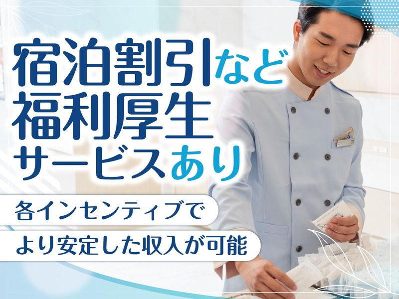 【保険制度】 雇用保険、労災保険、健康保険、厚生年金 待遇・福利厚生 【福利厚生】 ■社会保険完備 ■昇給年1回 ■賞与年2回(業績による) ■交通費支給(月5万円迄) ■各インセンティブ毎月変動支給 ■制服貸与 ■有給休暇 ■宿泊割引 ■企業年金 ■慶弔見舞金 ■健康診断成人病検診 ■退職金(勤続3年以上) ■再雇用有 (手当/資格・売上達成・稼働etc) ■社員割引(30%OFF) …家族・友人割引(20%OFF) ■資格取得支援制度 (入社後取得した場合のみ毎月手当支給) ■チャレンジ制度 (支配人や本社部門等、 他職種にチャレンジOK) ■ベネフィットステーション利用OK 映画・買い物・スポーツジム ・美容・遊園地など お得に利用できる優待サービス! 本人だけでなく家族も一緒に使えます♪