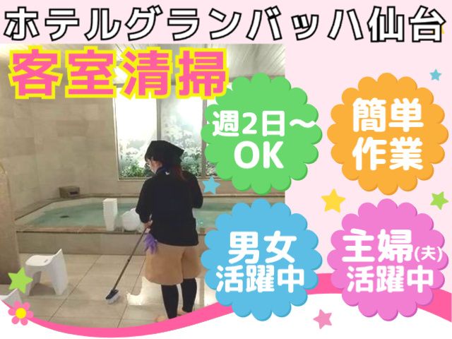 仕事内容 『清掃スタッフ』 パート・アルバイト募集! ≪採用人数:3~5名≫ ・ホテルでの清掃や、ベットメイクの経験ある方、 ・土日祝日勤務できる方、 積極採用いたします! 『客室清掃のお仕事』 仙台市宮城野区榴岡にある 「ホテルグランバッハ仙台」 の清掃、客室ベットメイクのお仕事になります。 ※仙台駅から徒歩5分 具体的には (1)玄関、廊下、16F浴室など館内共用部の清掃(募集人数1名) モップ掛け、拭き取り、床の清掃、ゴミ回収、トイレの清掃など ・未経験の方もできる簡単清掃です ・チームで動いて清掃をしていきます (2)客室清掃、ベットメイク タオル回収、ユニットバス清掃、ベッドメイク、 掃除機かけ、拭き掃除、ゴミ回収、など。 ・日勤メイク目標 8~10部屋(試用期間中は5~6部屋) ※(1)(2)いづれかの業務になります(相談可) <経験者歓迎> 経験のある方は積極採用いたします! 実務経験を活かし、活躍を期待しております! 未経験の方もOK!安心してご応募下さい。 <POINT!> ・週2日〜勤務OK! ・16時には業務終了! ・中高年も活躍中の職場です! 『幅広い年代活躍中』 若い世代からミドル・シニアの 中高年世代まで幅広い世代が 活躍している清掃のお仕事! 『働き方の相談OK!』 ・無理なく働きたい方⇒週2~3日 ・稼ぎたい方⇒週4~5日 出勤日はご相談ください。 土日祝のみ希望も大歓迎! シフト制で1ヶ月ごとにシフトを作成しておりますので、 ご家庭の用事や本業との調整などお気軽にご相談ください! ◇シフトサイクル:1ヶ月 ◇毎月20日頃を目安に次月の希望休を伺います 【こんな方におススメ!】 ・キレイ好きな方、お掃除が得意 ・適度に体を動かすお仕事がしたい ・空いた時間を有効活用したい ・ブランクがあるから心配 ・人に喜ばれるのが好き ・経験、年齢不問。未経験者歓迎! ・清掃のアルバイト求人を探している ・メンテナンス業界に、興味がある ・家事やプライベートと両立したい 不安な方もいらっしゃると思いますが、 楽しく働ける環境を大切にしております! 気になる点がございましたらまずはご相談ください! 清掃・ベットメイクのお仕事は 特別な資格は必要ありません。 清掃パートやアルバイト経験がある方も もちろんお待ちしております! 無理なく働きたい主婦(夫)の方や まだまだ働きたい中高年の方も ぜひご応募ください!