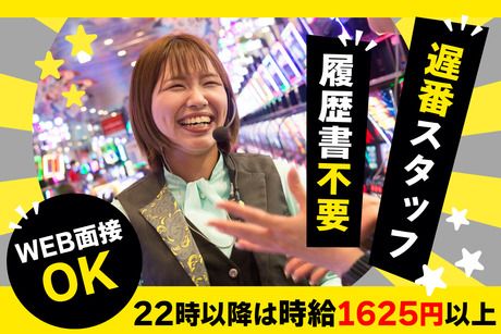 仕事内容 << 遅番シフト×高時給で賢く高収入GET >> 「夜の時間を使って、ガッツリ稼ぎたい。 でも、キツすぎるのは仕事は嫌だ…」 そんな理想を叶えたい方は、 ぜひベガスベガスへお越しください★ ▼ 体力的な負担は最小限!! ▼ ベガスは全台パーソナル(自動計数) だから、重い玉箱運びは一切ナシで、 日中の授業や副業との両立もラクラク! 「バイト後はクタクタで何もできない…」 なんて心配もありません! ▼ 未経験も安心のチーム体制 ▼ コンビニのような ” 1人きりのワンオペ ”もナシ! 常にインカムで仲間と繋がっているから、 困った時は10秒で先輩が駆けつけます(^^)/ ▼ 週3日~◎超・柔軟シフト ▼ 「今月はテストがあるから抑えめで」 「来月は旅行に行きたいからガッツリ」 「土日祝メインでかけもち」 など 前月に調整できる希望シフト申告制! 研修初日から時給1300円~スタート! 22時以降に時給が1625円以上にUP! 更に、土日祝は100円UP! 遅番ならで効率良く稼げますよ! 【 主な業務内容 】 ◆早番スタッフからの引継ぎ確認 ◆お客様のお出迎え ◆お見送りのご挨拶/ご案内 ◆計数機対応 ◆遊技台のトラブル対応、清掃・除菌 ◆お呼び出しアナウンス ◆賞品カウンターでの交換対応 ◆閉店作業、片づけ など \ お客様と会話を楽しみながら働ける / 「トイレはコチラですよ~!」 「空き缶のごみを捨てておきましょうか?」 「寒くないですか?空調の温度を変えますか?」 など、飲食店の接客と同じように、 あなたの気遣いが”おもてなし”に繋がります◎ \ パチンコの知識ゼロ・未経験もOK / 接客が初めての方や初バイトの方も大歓迎! 基本の接客対応マニュアルや、 先輩がトレーナーとして丁寧にサポート! 安心して始められる教育体制が整っています。 ◆先輩スタッフの声を紹介します お客様から直接いただく 「ありがとう」という言葉が 1番のやりがいです! 「今日出勤だったんだね」と、 顔を覚えて声をかけてくれる 常連さんもいます♪ そんな温かい雰囲気のお店なので お客様の立場に立った対応が 自然とできるようになると思います! ◆ネイル・髪色OK◎キレイな職場でおしゃれも楽しめる! 「パチンコ店はタバコの煙がもくもく」 そんなイメージは、もう一昔前の話! 最新の空調設備による 徹底した分煙で、空気は常にクリーン! 「服や髪にニオイがつくから、 お気に入りの服を着られない…」 なんて悩みとは無縁ですし、 仕事終わりにそのまま帰宅しても ニオイを気にせずリラックスできますよ♪ ネイル・髪色OKだから、 自分のこだわりも大切にできます。 深夜の割増時給で効率よく稼ぎながら、 おしゃれも全力で楽しんでください♪ ★月収25万円以上で年収アップを目指そう! 今のバイト、月収17万円で止まってませんか? ベガスなら、未経験からでも 【月収25万円以上】が可能なんです!! 毎月+8万円の余裕ができたら、 欲しかったコスメも、推し活も、貯金も、 自由に使えるお金が増えて充実ですよ!