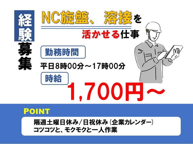 仕事内容 \高時給×未経験歓迎!モクモク作業/ 「残業無しでプライベートも充実させたい」 「人と関わるより、1人作業の方が向いている」 そんな方にピッタリの職場です! ー 【お仕事内容】 NC旋盤、溶接をお願いいたします。 シニア活躍中で経験者大歓迎です! ★作業はNC旋盤のプログラミングや溶接 ✅ 経験を活かせる職場 ✅シニアが大活躍中 ー 【働きやすさポイント】 ✔ 日勤のみ!生活リズムが安定 ✔ 隔週2日土曜日出勤、日祝休み+大型連休あり(GW・夏季・年末年始) ✔ モクモク作業中心!人間関係のストレス少なめ ✔ 駐車場も近いので通勤ラクラク ー 【こんな方におすすめ】 ・経験からものづくりの仕事に挑戦したい方 ・安定収入を得たい方 ・プライベートも大切にしたい日勤派の方 ・地元で長く働きたい方 ・とにかく稼ぎたい&即日スタートしたい方