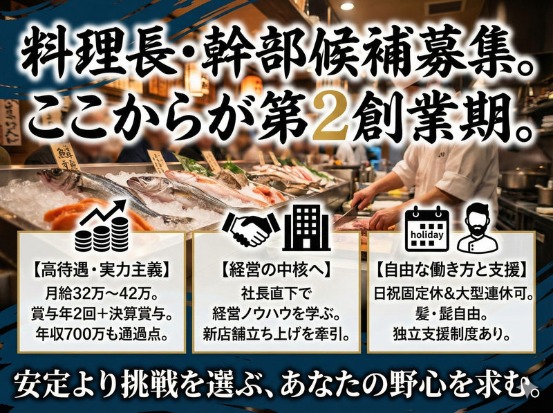 仕事内容 ✨月給32万円~/最高月給42万円 ✨賞与年2回+決算賞与で還元 ✨次期店舗の「料理長」ポストあり \神田の「名店」で終わる気はない/ 神田で創業36年。 連日満席の『魚海船団』は 確固たる地位を築きました。 しかし、私たちは ここで止まりません。 目指すは「5年後の年商10億円」。 ここからが本当の勝負、 いわば『第2創業期』です。 ただ料理を作るだけの スタッフは求めていません。 これから一気に拡大する 組織の「中核」となり、 私たちと一緒に 夢を現実に変えていく 「同志」を募集します。 【具体的な業務内容】 ✅質の高い魚料理の調理・提供 ✅原価管理・利益最大化の戦略立案 ✅新メニュー開発・ブランディング ✅新店舗の立ち上げ・運営管理 【入社後の流れ】 まずは現場を知っていただきますが、 早期にマネジメント業務も お任せする予定です。 社長の右腕として、 経営視点を養ってください。 ■採用担当者からのメッセージ ✨社長直下で経営ノウハウを学べる ✨ポストが空いており昇進が早い ✨成果は給与でダイレクトに還元