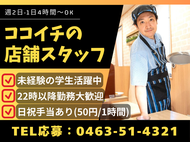 仕事内容 \家庭と両立できる安心バイト♪/ ✨主婦さん活躍中!!働きやすさ◎✨ ╒━━━━━━━━━━━━━━━━━━╗ ✅日曜&祝日手当あり【50円/1時間】 ✅【食事補助あり】家計の節約にも◎ ✅【1日4時間~】お子さんの予定に合わせてOK ✅【レシピ通り調理】家事スキルで十分! ✅【セルフオーダー】聞き間違えナシで安心 ✅【未経験歓迎】ブランクありでも大丈夫! TEL:0463-51-4321 ╘━━━━━━━━━━━━━━━━━━╝ 【⏩仕事内容】  ̄ ̄ ̄ ̄ ̄ ̄ ̄ ̄ 誰もが知る『カレーハウスCoCo壱番屋』 でのホール・キッチン業務になります。 「子育ての合間に」 「家事のスキマ時間に」 安心して始められます。 【⏩具体的には】  ̄ ̄ ̄ ̄ ̄ ̄ ̄ ̄ ̄ ✅お席へのご案内(混雑時) ✅お席へのお水運び ✅注文商品の調理・盛付 ✅お席への商品配膳 ✅下膳・お席の片付け ✅お会計・レジ対応 など ✨注文はタブレットでセルフオーダー! ┗ 接客が初めてでも安心♪ ✨キッチンはレシピ通りで大丈夫! ┗ 家庭料理の延長で無理なくできる♪ ✨できることから始めていきましょう! ┗お水の用意など簡単作業からスタート◎ 【⏩安心ポイント】  ̄ ̄ ̄ ̄ ̄ ̄ ̄ ̄ ̄ ̄ 困った時はお互い様の精神で、 みんなでフォローしています。 「閉店まで」や「土日祝勤務できる方」など 柔軟にシフト相談OK! ✨学校帰りに無理なく勤務OK ✨扶養内での勤務も相談OK → 家計に合わせてムリなく働けます! ✨ブランクがあっても安心の研修あり → 家事経験がそのまま活かせます♪ ✨同年代の主婦スタッフが多数活躍中 → 子育てや家庭のことも理解してもらえる♪ ✨シフトは店長や仲間と一緒に調整 → 急な予定変更も相談しやすい職場です! 応募理由は ココイチが好き、カレーが好きでもOK!!