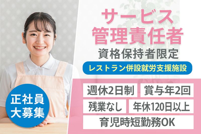 【雇用形態】 正社員 【契約期間】 試用期間3ヶ月(同条件)。その後、正社員のため無期雇用。 【その他】 #サービス管理責任者資格 #普通自動車免許(AT限定可) #未経験者歓迎 #フリーター歓迎 #主婦・主夫歓迎 #経験者歓迎 #有資格者歓迎 #ブランクOK #学歴不問 #40代以上応募可 #50代以上応募可 【ハローワークへの求人掲載について】 弊社の求人はハローワークに掲載していない案件が多数ございます。(ハローワーク求人掲載は期間が経つと自動的に掲載が止まるため)お気軽にお問い合わせください。 【このような方活躍】 就労支援施設でサービス管理責任者(サービス管理、サービス管理者、管理責任者、支援、管理職候補、障がい者支援)で働きたい方。サービス管理責任者経験やサービス管理責任者資格をお持ちの方。週休2日制、年休120日、残業なし、育児短時間勤務制度ありの就労支援施設でサービス管理責任者として働きたい方。未経験、新卒、ブランクOK、主婦主夫、中高年層も活躍している職場で働きたい方。サービス管理責任者で正社員で働きたい方。サービス管理責任者を新着急募。サービス管理責任者、正社員、就労継続支援、サビ管、就労支援。 求人ID【P-WPF05】