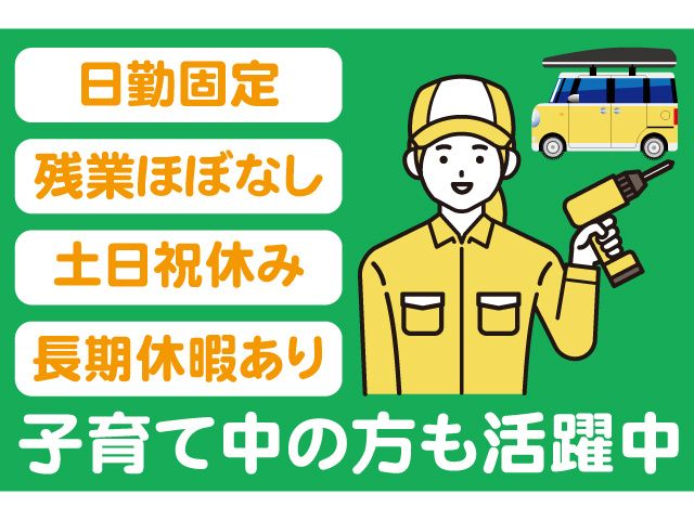 仕事内容 カーアクセサリーや 車用のアタッチメントの 製造をしている工場でのお仕事。 車の屋根上に取り付け、 キャンプ用品やスキー・スノボなどを 収納することができる 荷物収納用の箱型アクセサリー 「ルーフボックス」の製造に関するお仕事です。 未経験者歓迎!資格・経験不問の かんたん組み立て作業! 空調完備のキレイな作業環境でのお仕事です。 ・日勤固定 ・残業ほぼなし ・土日祝休み ・長期休暇あり プライベートを重視しながら 無理なく長くご活躍いただけます。 現在20代~40代女性活躍中。 子育て中の方も活躍中! 【お仕事内容】 電動ドライバーを使用しての 自動車用ルーフボックスや キャリアの組立作業をお願いします。 また、ラベル貼りや梱包作業などもあります。 製品は樹脂製なので軽量。 重い物を持ったりといった重労働はありません。 冷暖房完備の年中快適な室内で モクモク集中できるお仕事です。 【特徴】 髪色・髪型等自由! 自分らしいスタイルで働けるのが うれしいポイントです。 給与の「週払い」にも対応可能! 働いた分をすぐに受け取れます。 工場でのお仕事がはじめてでもOK! 採用後はOJTで丁寧に指導します。 同じ職場に弊社スタッフも在籍しており、 分からないことはサポートしますので 工場・製造の仕事が初めての方も 安心してご応募下さい! 【こんな方が活躍中】 ・家事や育児と両立して働きたい ・子育てが落ち着いて仕事復帰を考えている ・新しい事に挑戦してみたい ・未経験でもスタートしやすい仕事を探している 【応募方法について】 WEB応募よりエントリーください 24時間受付中です お電話でのお仕事内容や、 採用に関するお問い合わせもお気軽に! 入社日も相談に応じます TEL.0285-23-0904