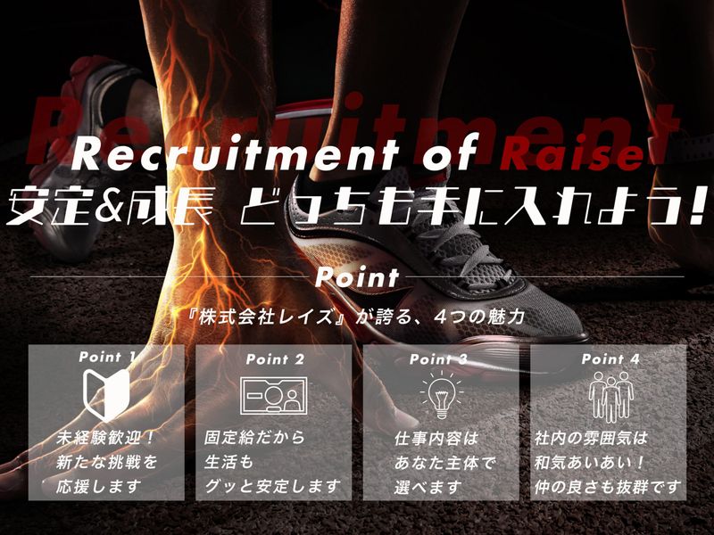 アピールポイント ー ここがやりがい! 感謝の声が直接届く仕事 ー お客様先で対応しているからこそ、 感謝の声は直接もらえることがほとんど! 空調設備=生活を支える仕事なので、 将来性も抜群です。長年の実績もあり、 お客様からの信頼も厚いです! 企業HP/施工実績などが見れます! https://www•raise0507.co•jp/ ー \こんな職場で働ける/ 【中途社員の比率が高い】 ー 定着率が高く、給与の良さに 満足の声が多い職場です。 早上がりでも給与は保証され、 頑張りはしっかり評価! 休日出勤は完全希望制で、 稼ぎたい方だけでOK。 20〜30代が多く、 和気あいあいとした 雰囲気のなかで働けます。