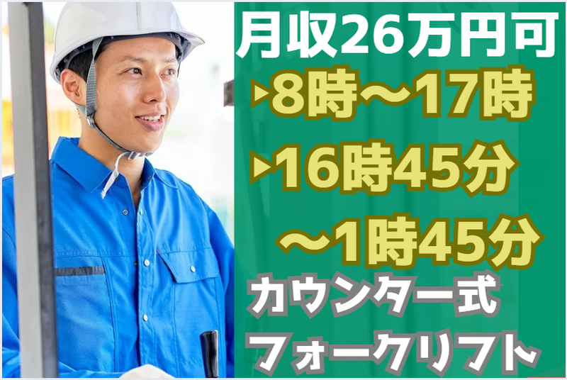 仕事内容 \\求人のPOINT// ==================== ✅ フォークリフト免許を活かして働ける! ✅ 日勤もあプライベートも充実✨ ✅ 高時給で稼げる!! ✅ 土日祝休みでワークライフバランス◎ ==================== ⭐ 仕事内容  ̄ ̄V ̄ ̄ ̄ ̄ ̄ ̄ ̄ ̄ ̄ ̄ ̄ ̄ ̄ ̄ ̄ ̄ 工場で使う部材をフォークリフトを使用して運搬をお願いします! ▶主な作業内容 ✅部品や材料を倉庫内で運搬 ※カウンターフォークリフトを使用します ✅その他、付随する簡単作業 体への負担は少なめで安心です✨ ✦・━・✦・━・✦・━・✦・━・✦・━・✦・━・✦ 物流の現場を支える大切なポジション! 倉庫全体の流れをスムーズにする“要”の仕事! 未経験の方でも フォークリフト免許をお持ちであれば、 丁寧な研修で安心スタートできます◎ 安心してご応募ください⭐