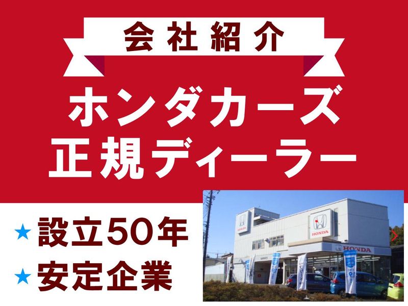 仕事内容 ホンダカーズの正規ディーラーとして 1975年に設立して50年、 所沢の皆様に長年愛されてきました。 今回は、1人1人のお客様としっかり 向き合ってくださる営業職を募集いたします。 保険などの販売手続きや 購入後のアフターフォローまでを行う 営業の仕事です! 【具体的には】 新車を購入しにきたお客様にご案内をし、 お客様に合った車を販売するお仕事です。 また購入時のローンの説明、 車検の案内、各種保険などの 販売手続き、提案、 購入後のアフターフォローまでを 行う営業もして頂きます。 ご来店される方は もともと車へ興味のある方がほとんど。 販売後のアフターフォローは 新型車やモデルチェンジご案内の電話や DM送付、車輌コンディション維持の ためのメンテナンスの案内など 初めてお客様と商談をする際には 店長も同席しますのでご安心ください◎ 3ヶ月ほどで1人で商談ができるようになります! 車の販売なので、 車のことを覚えるのは当然。 ただディーラーの仕事ってそれだけじゃないんです。 お客様が希望する車輌のご案内はもちろん、 生活シチュエーションに合わせて どんな車やオプションがオススメか、 ローンの組み方をどうするかなど、 様々なご提案をします。 購入時の自動車保険や定期点検、 車検の手続きも行うのは自分。 また定期点検やメンテナンスに モデルチェンジの案内など アフターフォローも大切な仕事です。 そういった1つ1つの仕事がお客様の喜びに繋がり、 信頼関係を築いていけます。 反響営業だから準備をしてしっかり お話しできるのも魅力の1つ。 転勤もないのでお客様とは 長いお付き合いができます。