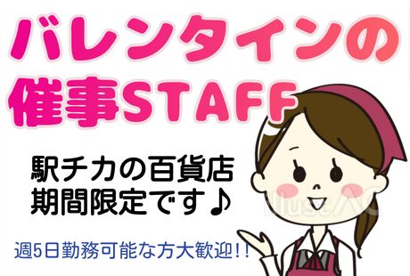 仕事内容 <駅チカの百貨店で販売STAFF急募> あの有名なチョコレートのお店でのお仕事(^o^)/ 主なお仕事内容 *店舗や催事会場において店頭でのレジや販売 *品出し、納品片付けなど 駅直結なので通勤ラクラク♪幅広い年代の男女活躍中! ◎百貨店で勤務経験がある方歓迎、デパ地下で勤務経験がある方尚可♪ ◎販売・接客経験を活かせます! <オススメPOINT> ☆初日から時給1500円でしっかり稼げる! ☆交通費全額支給いたします ☆困ったときに安心の日払い・週払い対応可能(規定あり)! 「接客業の経験を活かして」 「洋菓子が好き」 「レギュラー勤務が希望」 など、スタッフの応募動機は様々です! <幅広い世代の男女スタッフ活躍中> 過去に百貨店でレジ経験がある方や、 接客販売経験のある方大歓迎! 経験を活かせるお仕事となっています☆ お仕事ブランクがある方もまずはご相談くださいね(^^)/ <選べる勤務地!来年1月~2/14の短期募集♪> (1)阪急うめだ 1月上旬からスタート (3)京都高島屋 1/17からスタート (2)阪急西宮(4)近鉄奈良(5)阪急神戸(6)大丸梅田 1/21からスタート (7)千里阪急 2/4からスタート