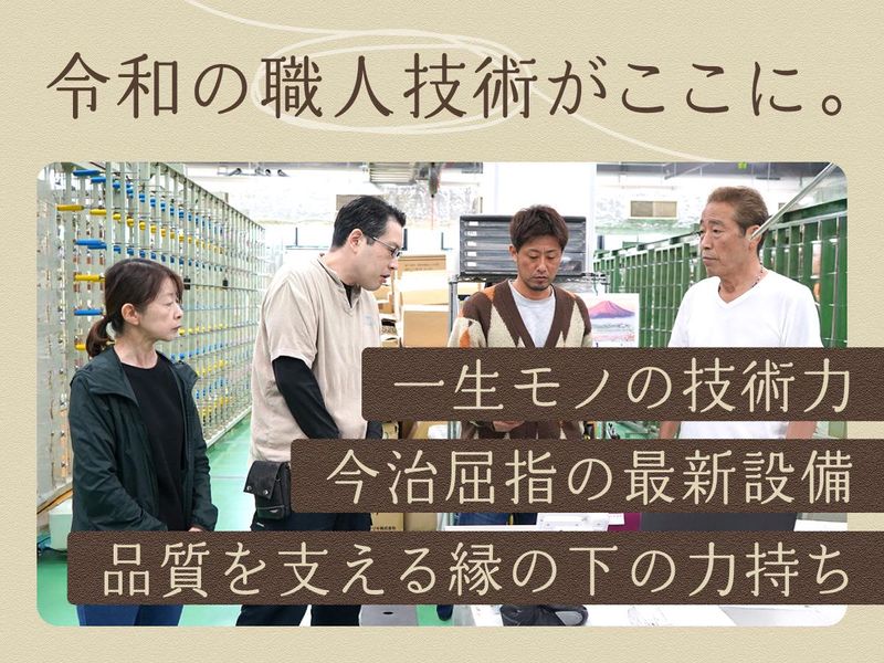 仕事内容 あなたが担うのは、タオル作りの「生地づくり」。これからタオルになる土台の生地を織る「製織(せいしょく)」という工程を担当いただきます! より良い今治タオルをつくるため、前後の工程担当との密な連携が大事なポジションです。 【タオルの製造工程】 [1]糸を仕入れる ▼ [2]デザイン・企画を立てる ▼ [3]糸を染める ▼ [4]糸を大型ドラム(以降、ビーム)に巻き付ける ▼ [5]織機にかけ、タオル生地をつくる ✅あなたにお任せするのは、この工程! ▼ [6]のり抜きの加工をする ▼ [7]縫製し、商品に仕上げる ▼ [8]検品・出荷する 丸栄タオルの製織部門は、今治エリア最新鋭の全風量空調設備と、16年のベテランが築いたデータベースを武器に、タオル作りの根幹を担っています。 前工程の整経(せいけい)で準備された糸が、あなたの手で実際にタオル生地へと姿を変えます。データを参考にしつつ、糸のテンション、織りのスピードを微調整。「思い通りの仕上がり」となった瞬間の達成感は格別です! 【具体的な作業の流れ】 [1]糸の接続:整経部門から届いたビーム(経糸を巻いたもの)を織機にセットし、上糸・下糸を結んで繋ぐ ▼ [2]データ入力:タオルの柄や織り方のデータを機械に入力 ▼ [3]織り作業:織機で糸を縦横に交差させながらタオル生地へ ▼ [4]品質チェック:糸切れや柄の乱れが出ていないか常に確認 ▼ [5]仕上げ:規定の長さまで織り上げたら織機から切り離し、次工程の担当へ送る 【1日の作業量】 フェイスタオル、バスタオル、スポーツタオルなど6〜8種類の製品を、データと経験を駆使して織り分けます。 ー ✨この仕事の魅力 ー ✅今治随一の「綺麗すぎる工場」で働く まるでオフィスのようなクリーンな環境です! ◆全風量空調完備:通常の工場なら、1日稼働すると機械の上に「雪が積もったように」綿埃が溜まりますが、丸栄タオルでは最新の空調システムで綿埃をほぼゼロに。1年中、温度・湿度が一定に保たれた快適空間で作業できます。 ※今治でも数社しか導入していない設備 ◆全社LED照明:明るい職場で糸の状態をしっかり確認でき、目の疲れも軽減。不良品を見逃さない環境づくりにこだわっています。 ✅「勘」をデータで継承する令和の職人スタイル 「背中を見て覚えろ」ではなく、糸切れの対処法、柄ごとの最適設定、トラブル予測のコツをデータ化。「このタオルは、この数値で」という再現性の高いノウハウがあるから、未経験でも1年で第一線で活躍できる環境です! でも、最後は「感覚」が決め手。「5年かけて身につく勘」——数値では表せない微調整の技術は先輩から直接学べる、この仕事の奥深さです。データで8割、残り2割の職人技が最高の品質を生み出しています! ✅自社ブランドを支える誇り 丸栄タオルは、今治タオルメーカーの中でも珍しい「SPA(製造小売業)モデル」。あなたが準備した糸が、銀座・大阪・博多の直営店【今治浴巾(いまばりよっきん)】、そして海外でも販売される自社ブランドタオルになります。 自分が織ったタオルが、全国の店頭に並ぶ喜びと誇り。これらが、何十年と続ける先輩が沢山いる理由です!