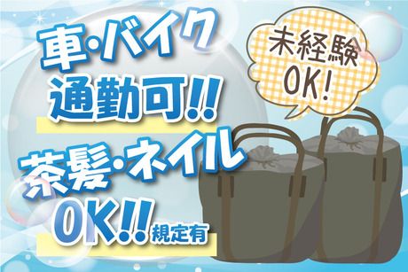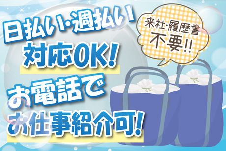 仕事内容 ◆工場内でモクモクとできる軽作業! 工場内でのカンタンな軽作業をお願いします。 扱うものは【コンテナバッグ】です。 お客様が使用したコンテナバッグを綺麗に洗浄し、 点検をおこなって安心・安全に利用していただけるようにします♪ 全くの未経験からスタートできます! <主なお仕事内容> ・数量の確認、種類別に仕分け ・洗浄のための前処理 ・洗浄・乾燥工程へ ・汚れや傷みが無いかをチェック ・その他付随する業務 ◆職務経験不要♪30代~50代の男性スタッフ活躍中! 「軽作業のお仕事は初めて」 「工場作業の経験がない」 「久しぶりのお仕事復帰」 「モクモク、コツコツ作業が好き」 など…どんな方も大歓迎! お仕事の進め方などしっかりお教えします♪ 社内の人間関係も良好で、 分からないことは気軽に質問しやすい環境ですよ◎ 新入社員の皆さんも「すぐに慣れることができた」と好評の職場です! ◆平日のみの安定勤務!週末はしっかりリフレッシュ♪ 「日勤専属&土日祝休みで無理なく続けやすい」と 長期でがんばるスタッフが多数活躍中♪ 休憩時間も多めでメリハリよく働ける職場です◎ 高時給でしっかり稼ぎながら ブライベートも大事にしたい方にピッタリ! 【来社&履歴書不要!電話でお仕事のご紹介が可能です】 今回募集しているお仕事に関して もっと詳しく説明してほしいと思われた方にはお電話でしっかり説明します。 来社&履歴書不要でお仕事のご案内が可能なので 仕事や休みの日や仕事終わりなど、 あなたの都合のよいタイミングでご連絡いただければ希望のお仕事をご案内します。 まずはご応募ください。