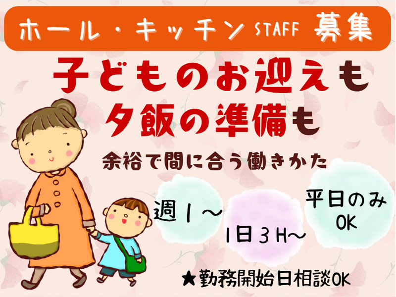 仕事内容 接客・レジ・キッチンのお仕事です。 未経験から始めた仲間ばかり! タッチパネル式でどなたでも簡単に 覚えられるので安心してくださいね! キッチンはマニュアルに沿った 簡単な作業だから、どなたでもすぐに 慣れて頂けますのでご安心下さい。 学校やWワークなど諸事情で 「キッチンしか入れない」 逆に「手があれやすいからホールだけで」 なんて方も柔軟に対応します◎ 気さくで優しい仲間ばかりで、 毎日わいわい楽しく働いています。 1日3H~の超時短勤務もOK 週1~OK! スケジュールも立てやすい! 学校行事や、試験休み、 お子さんの急な体調不良など、 何でも相談してくださいね。 期間の相談もお気軽に! その後のシフトも相談OK