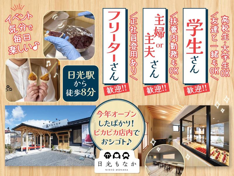 仕事内容 ✨ 和スイーツのお店でアルバイト・パートしませんか? ✨ ✨高校生・大学生さんでお友達と 一緒にバイトしたい方はご一緒に 応募いただいてもOKですよ!✨ 「難しそう・・・?」 そんな心配はいりません♪ もなかの皮にあんこ塗ったり、 大福を作るなど簡単なお手伝いから スタートができるので未経験でも大丈夫♪ ☘マニュアル完備&先輩スタッフが 丁寧に教えてくれるから安心! ☘1週間くらいで基本の作業はマスターできます! <接客のお仕事> 「お会計」「ラッピング対応」など、 「美味しい!」「また来るね!」 って直接言ってもらえるのが嬉しいポイント◎ <店頭のお仕事> お客様に美味しさと“楽しさ”を 伝える工夫にもチャレンジできます! ちょっとしたデコレーションや アイデアを出すのも大歓迎! 就活でも活かせるスキルが 身についちゃうかも!?♪ <もっと経営にも関わりたい!> 「在庫管理」「商品発注」 「季節限定メニューなどの新商品開発」 慣れてきたらこんなところまで 一緒に参加できるので 将来同じ業界で活躍したいという方 には持ってこいの環境です♪ 新しいお店を一緒に育てていく そんな楽しさをぜひ味わってください!