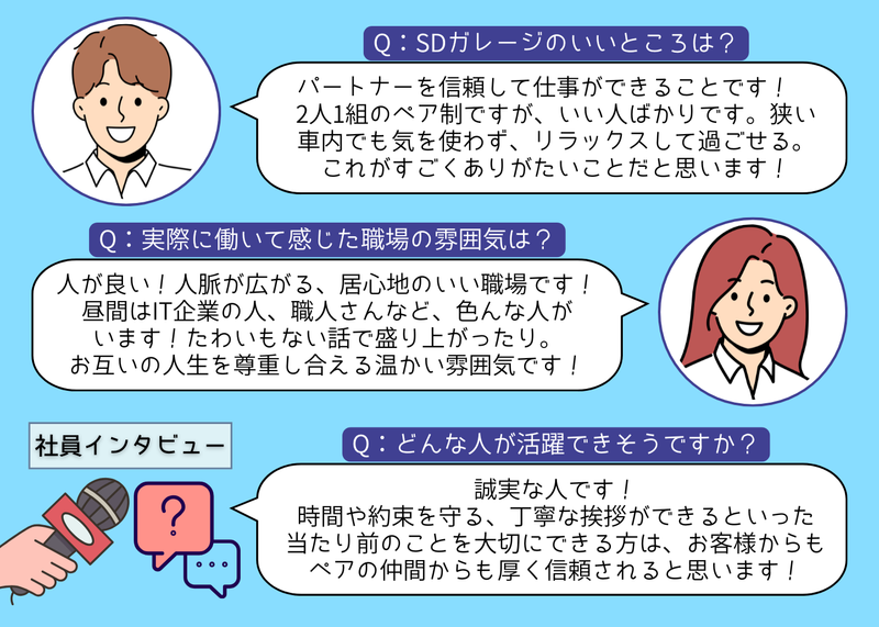 仕事内容 \\ノルマに追われず自由シフトで働ける!// ✨【2種免許:運転代行ドライバー(業務委託)】✨ 松戸市を拠点に、お客様の約80%がリピーターという高い信頼をいただいている「SDガレージ」! お客様に代わって、目的地まで安全に送り届ける重要なお仕事です。 タクシー、バスなどの運転経験を活かして、しっかり稼げる環境で、効率よく稼ぎませんか? ✅ 働く魅力(ここがポイント!)  ̄ ̄V ̄ ̄ ̄ ̄ ̄ ̄ ̄ ̄ ̄ ̄ ̄ ̄ ̄ ̄ ̄ ̄ ✨ 売上に応じた歩合給!専業で月収40万円以上の報酬も可能です◎ ✨ 2種免許があれば、運転にのみ集中できる環境🚗 ✨ 嬉しい日払い対応!急な出費にも対応できて安心です♪ ✨ 週1日・時短OK!スタッフの6割が副業として活躍中! ✨ リピーター率約80%!地元密着で安定した仕事量です! ✅ 具体的な仕事内容  ̄ ̄V ̄ ̄ ̄ ̄ ̄ ̄ ̄ ̄ ̄ ̄ ̄ ̄ ̄ ̄ ̄ ̄ 千葉県松戸市を中心としたエリアで、客車代行運転ドライバーをお任せします! ◆運転代行業務 ・お客様の車の代行運転 ・随伴車の運転 ▼追加で下記業務をお願いすることもあります! ◇内勤業務・お客様からの注文受付 ・無線による配車業務 ・事務作業、庶務 ・売上集計、データ入力など ◇ロードサービス業務(別途就業条件あり) ・JAF依頼による故障車 ・事故車の救援 ・積載車での車両搬送 ✅運転代行未経験の方でも安心!  ̄ ̄V ̄ ̄ ̄ ̄ ̄ ̄ ̄ ̄ ̄ ̄ ̄ ̄ ̄ ̄ ̄ ̄ ご経験は一切不問です! 「今の生活リズムを崩さずに収入を増やしたい」 「気分転換になるような、別の繋がりが欲しい」 「夜のドライブ感覚で、運転の好きを活かしたい」 そんな気持ちがあれば大歓迎です✨ 当社のスタッフは、多彩なバックグラウンドを持つメンバーばかり! しっかりと「教えてもらえる」文化が根付いています。 今までの運転のご経験を存分に活かせる環境があります! ✅入社後の流れ  ̄ ̄V ̄ ̄ ̄ ̄ ̄ ̄ ̄ ̄ ̄ ̄ ̄ ̄ ̄ ̄ ̄ ̄ ⏰まずは座学研修で運転代行の基礎知識や具体的な仕事の流れを理解 ⏰先輩のサポートを受けながら実務を習得 ⏰実際に運転代行の業務に挑戦 ⏰将来的には幹部候補としてのキャリアアップも可能 ✅株式会社SDガレージとは?  ̄ ̄V ̄ ̄ ̄ ̄ ̄ ̄ ̄ ̄ ̄ ̄ ̄ ̄ ̄ ̄ ̄ ̄ 弊社は、運転代行・ロードサービス事業を展開する地域密着型企業です! 松戸市を拠点に、お客様の約80%がリピーターという高い信頼をいただいており、 「安心して任せられる存在」として着実に成長を続けています。 弊社の自慢は、単なる「運転」だけで終わらない仕事の幅広さと、 何よりスタッフ同士の絆の深さ。 異業種から転職してきた仲間たちが、 一つのコミュニティのように互いを高め合いながら活躍しています! ✅ 社員インタビュー  ̄ ̄V ̄ ̄ ̄ ̄ ̄ ̄ ̄ ̄ ̄ ̄ ̄ ̄ ̄ ̄ ̄ ̄ ✨しっかり稼げますか? はい!お客様の車を直接運転する客車ドライバーは高報酬が得られます。 力仕事が一切なく運転に集中できる環境なので、専業で月に35〜40万円稼ぐことも可能です! ✨副業でも働きやすい環境ですか? スタッフの60%が副業として活躍しています! 週1日からの柔軟なシフトや時短勤務制度があり、日払いも基本なので、 スキマ時間で効率よく収入を上げるのにぴったりです! ✨職場の雰囲気や人間関係はどうですか? 昼間はIT企業の人や職人さんなど、本業がバラバラな多様な仲間が集まっています! 2人1組のペア制ですがいい人ばかりで、タクシーと違って、常に相方がいるのが心強いです。 道に迷った時や、ちょっとした休憩中も心細くないのが代行のいいところですね! \\皆様からのご応募を心よりお待ちしております✨//