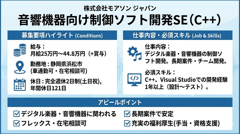 ✅デジタル楽器・音響機器の制御ソフトを担当✅半年〜数年の長期案件が中心で開発に集中✅フレックス+在宅相談可、時短も相談可