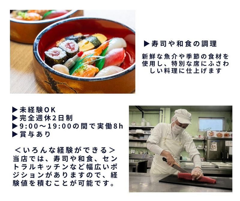 【アピールポイント】 \働きやすい職場で新しいキャリアをスタート/ 寿司・和食の仕出しキッチンスタッフを正社員募集! ◆未経験OK ◆完全週休2日制 ◆9:00~19:00の間で実働8h ◆賞与あり