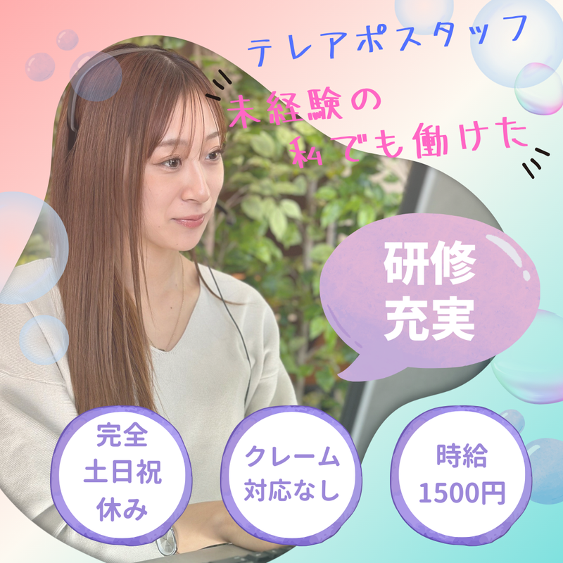 仕事内容 \推しポイント/ ◆未経験OK:トーク例&マニュアル完備/研修ありで専門知識不要 ◆アドリブ不要:マニュアル通りに案内→アポ後は社員へ引き継ぎ ◆働きやすい:土日祝完全休み&残業ゼロでメリハリ◎ ◆稼げる:時給1,500円+インセンティブで月収UPも目指せる ◆自由度高め:週4日〜OK/時間帯相談可(朝ゆっくりスタートも) ◆待遇充実:交通費全額支給・有給あり・社会保険完備 時給1,500円+インセンで、ちゃんと稼げるオフィスワーク! トークはマニュアル完備&アドリブなしで未経験でも安心。 在宅OKだから、自分のペースで働きやすい◎ 土日祝休み・残業ゼロでオンオフきっちり! 年内からお仕事スタートOK◎ ===== こんなスタッフが活躍中! ===== ●Aさん● 「旅行資金を貯めたいので、フルタイムでガッツリ働いています!」 ●Bさん● 「推し活貯金しなきゃ!そのために、高時給のテレアポバイトでしっかり稼いでます!」 ●Cさん● 「人と話すのが好きなので、テレアポは自分にピッタリ!」 <具体的には~> *既に自社でご契約済みの企業さま向けに新サービスのご案内 *マニュアル通りにトーク! *ホームページ運用のメリットを伝えていただきます! *アポイントを取った後は社員に引き継ぎでOK! <お仕事の流れ> パソコンからワンクリックで電話をしていきます! IT関連サービスの簡単なご案内をお願いします! マニュアルに沿ってお話するだけでOK!未経験でもカンタンにご案内できます! *テレアポ・コールセンター経験者歓迎!! IT関連のサービス案内ですが研修で学べる時間があるので専門知識は不要です。 どんな方でも活躍できるようバックアップしています!安心して応募してきてくださいね! <こんなスキルが身についちゃう> *コミュニケーション力・営業力 *社会人マナー/電話応対スキル *将来の営業職・接客業にも活かせる *会話の組み立て方・相手のニーズの聞き出し方が学べる 将来的に営業職を目指せる【正社員登用制度あり】 アルバイトから正社員になったメンバーも在籍してます♪ 【 必要なものは会社が準備 】 入社が決まり次第、あなた専用のパソコンを準備します! パソコンに詳しくない。。という方もご安心くださいね! 難しい操作は一切しません! 【 アドリブなし 】 「テレアポってコミュ力が必要なんじゃ。。」 と不安なあなたも大丈夫。 丁寧なトーク例があるのでそちらに沿って ご案内を進めていけばOKです! 【 いつでも頼れる 】 活躍中のメンバーはほとんどの方が未経験スタート。 近くに先輩社員もいるので、困ったらすぐに質問できます! 直接口頭で聞くのはちょっと・・・っという方も安心! LINEなどチャットツールでのやり取りもスムーズに行えます! サポート体制もばっちり。マニュアルがしっかり決まっているので安心! 分からないことがあればすぐにフォローします!