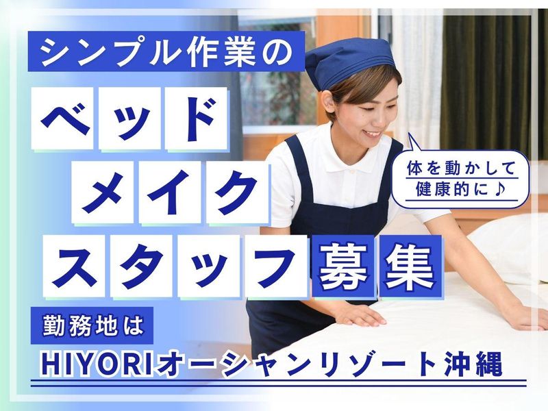 仕事内容 ✨恩納村のリゾートホテルでのお仕事♪ ✨未経験スタート大歓迎‼ ✨1日5.5h勤務☆固定のお休みもOK‼ ✨車・バイク通勤OK!駐車場あり◎ ・:・。*。・:・。*。・:・。*。・:・。*。・:・。*。・:・ 【仕事内容】 ✅使用済みシーツ・カバーの取り外し ✅新しいリネン類への交換 ✅寝具の汚れや破損がないかチェック あなたにお任せするのは、 リゾートホテルでの ベッドメイクのお仕事✨ ベッドを美しく整えることはもちろん、 ご宿泊になったお客様が 「ぐっすり眠れた」「気持ちよく休めた」 と感じてもらえるような 心地よい空間づくりをお願いします◎ ・:・。*。・:・。*。・:・。*。・:・。*。・:・。*。・:・ ⛅HIYORIオーシャンリゾート沖縄とは⛅ 2021年にオープンした当ホテルは、 すべての客室がオーシャンビュー、 キッチン・洗濯乾燥機を備えた スイートタイプのお部屋です。 『暮らすように過ごせる』をコンセプトに、 国内外のお客様へ快適で 上質な滞在をご提供しています。 高台から海を見渡せる心地よい環境の中で、 仲間と協力しながら チームワークを大切に働ける職場です。 ・:・。*。・:・。*。・:・。*。・:・。*。・:・。*。・:・