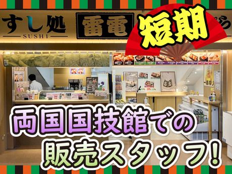 仕事内容 <短期>2026年5月10日~5月24日までのお仕事です! ――――――――――――――― ★両国国技館でオシゴト! ★時給1400円! ★未経験OK! ――――――――――――――― 両国国技館2階にあるすし処で 短期レジスタッフ大募集! 相撲に興味がある方も詳しくない方も どちらも大歓迎です! 他イベントへのサポートも可能です! <具体的な仕事内容> ◎テイクアウトすしのレジ ◎販売フォロー \未経験OK!/ レジは商品のバーコードを 読み取ってお会計するだけ! 研修もありますので、 レジ経験のない方もご安心ください! 相撲の聖地、両国国技館内のすし処! 各種寿司弁当のテイクアウトがメインですが、 寿司職人が新鮮なネタを目の前でにぎる 立ち食いカウンターもあり、連日大人気のお店です! 通勤ラクラク♪ JR両国駅から徒歩3分! 大江戸線も使えてとっても便利◎ 馬喰町駅からも徒歩圏内です! \こちらの駅からも通いやすいです!/ 錦糸町駅、亀戸駅、浅草橋駅、新宿駅、秋葉原駅、 御茶ノ水駅、水道橋駅、上野御徒町駅、蔵前駅、 森下駅、清澄白河駅、門前仲町駅 など スタッフに大好評◎食事補助あり♪ 勤務中のお昼はお得にどうぞ◎ まかないが300円で食べられます!
