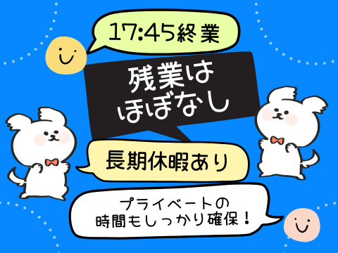 勤務時間詳細 【勤務時間】 8:45~17:45(実働8時間/休憩60分) 【勤務日数】 週5日(土日祝休み) 【残業ほぼなし】 原則定時退社! 残業は月1時間前後と、ほとんどありません。 「毎日17:45にはサッと退社」が 当たり前の職場なので、 仕事後の予定も立てやすいですよ◎