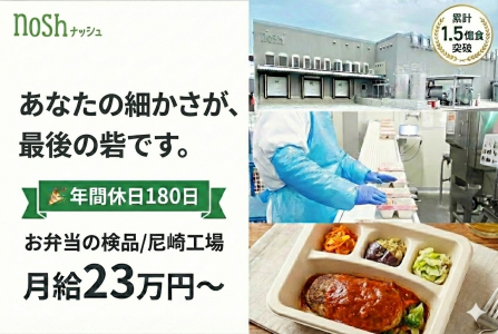 仕事内容 ━━━━━━━━━━━━━━ ✅ 「美味しそう!」を作る、 noshの最後の仕上げ役。 ━━━━━━━━━━━━━━ ■求人のポイント ──────────────── ・30代〜40代が主役!活気あるチーム ・色とりどりの具材を並べる楽しさ ・年休180日(2勤2休)で自由な時間も◎ ・2022年完成!空調完備のピカピカ工場 ・スピード昇格で月収10万円UPも可能 ■お仕事のイメージ ──────────────── 調理された具材を、お弁当の容器に 美しくセットしていく工程です。 「お肉はここ、副菜はここ」と 決まった場所に並べていくので、 パズルを完成させるような面白さが あります! 【具体的な作業】 ・ベルトコンベアでの盛り付け作業 ・具材が崩れていないかの目視チェック ・自動で重さを測るマシンの見守り ・数名のスタッフへのポジション指示 重いものを持ったり、難しい機械を 操作したりすることはありません。 チームで声を掛け合いながら、 「1.5億食の品質」を支えていく。 そんな一体感が味わえる現場です。 ━━━━━━━━━━━━━━ ✅ 2022年誕生の、最新スタジオ ━━━━━━━━━━━━━━ 作業場は、冷暖房完備で1年中快適。 最新の衛生管理システムが整っている クリーンな環境です。 「工場って、なんだか暗そう…」 そんなイメージは、尼崎工場に来れば きっと180度変わるはずです!