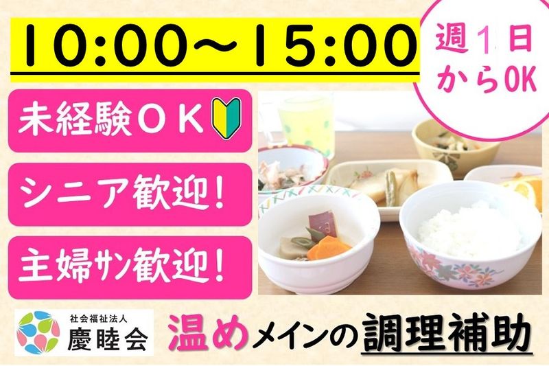 【仕事内容】 介護施設での「ご利用者様の食事の調理補助」のお仕事です! 料理・調理の経験や資格はいりません。 時間の前後の調整はご相談に応じます! 扶養範囲内の希望歓迎!20代~70代の幅広い年代のスタッフ活躍中! Wワーク・トリプルワークさんも歓迎です! ■お仕事内容 ・調理済みの料理の仕分け、盛り付け ・食器洗い ・数名分の食材の刻み(飲み込みやすくするため) ※調理方法などは丁寧にお教えします。 ■ポイント 調理は、とっても簡単ですが、「すごく美味しい!」と評判のメニューです。上手に盛り付けていただければより一層喜ばれます! 「美味しかったよ」「ありがとね」と言っていただけるやりがいのあるお仕事です。 ■ご応募について いきなりの面接は不安な方や、まずは施設の様子をしりたい、お話を聞いてみたいという方のお問い合わせも大歓迎です。 まずは施設見学だけでもしてみませんか?