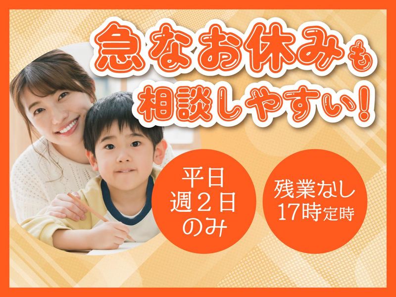 勤務時間詳細 08:15~17:00(休憩60分あり) *月~金の間で週2日勤務 *残業ほぼなし *扶養内勤務OK