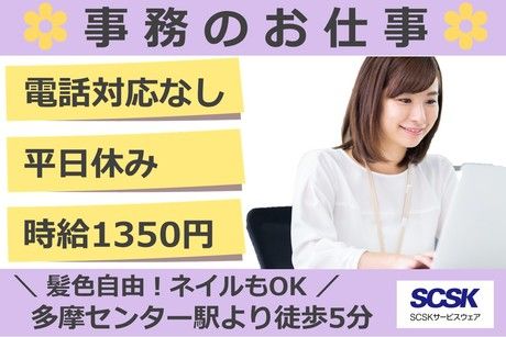 仕事内容 \ おすすめPOINT / ◎コツコツモクモク、電話なしのPC作業 ◎服装・髪色自由/ネイル・ピアスもOK ◎住宅ローン申込書のデータ受付処理 ◎多摩市/多摩センター駅より徒歩5分 ――――――――― ◆ お仕事内容 ◆ ――――――――― 有名大手ネット銀行/事務センターでのお仕事です。 住宅ローンのお申込に関する、下記の業務をお願いします。 PC上での画像データ等を使用した作業で、紙書類は扱いません。 (1)申込データのダウンロード、システム取込作業 (2)申込リスト作成、顧客データベースでの照合作業 (3)書類データの振分、入力作業 (4)内容不備、本人確認書類のチェック (5)ローン審査情報の登録作業 (6)審査結果の通知データ作成、納品作業 工程ごとにチームが分かれているため、(1)~(6)いずれかのチームに配属となります。 各チームへ配属後にそれぞれOJTを行います。 業務自体はむずかしいものではありませんが、 複数のシステムやツールを開いての作業となります。 電話対応はありませんので集中してお仕事ができます。 <業務内容>変更の範囲 会社の定める業務内容 \ 採用担当より / 通勤ラクラクな多摩市/多摩センターでの勤務、 駅周辺には有名チェーン店や飲食店が充実、 かわいいキャラがたくさんの、あの有名テーマパークの隣です。 SV・リーダー・メンバーあわせて約120名規模のセンター、 PC作業が多いので全体的に静かな、集中してお仕事ができる環境です。 ロッカーやリフレッシュルーム完備のオフィス環境。 服装自由だからいつもの気軽な格好でOK。髪色もネイルも自由です。 勤務地は多摩市/多摩センター駅から徒歩5分の駅チカ。 フルタイム長期のお仕事です。