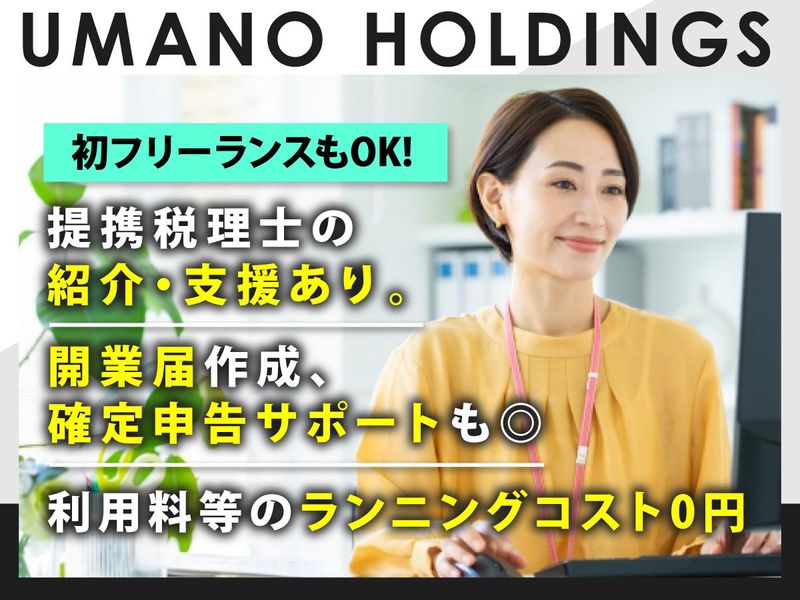 待遇・福利厚生 【福利厚生】 ・提携税理士の紹介・支援 …開業届作成、確定申告サポート ・任意加入の保険のご案内 …個人事業主専用の保険に加入し、 安心して働けるようにサポート実施 ・賠償責任保険 ・弁護士保険
