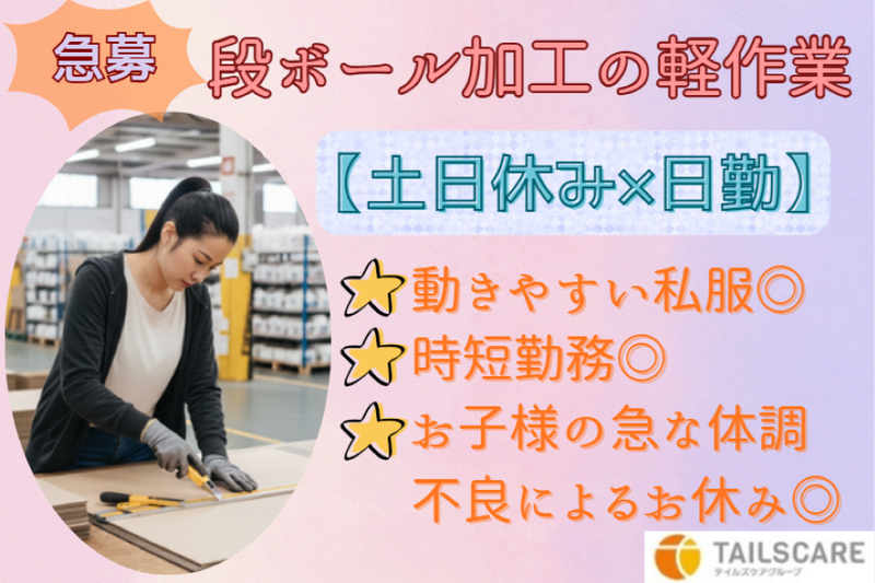 仕事内容 \未経験でもすぐ慣れる♪/ ✨カンタン軽作業!体への負担もなし✨ 扱う資材が段ボールなので重い物はありません ✨急なお子様のお休みにも理解のある職場✨ 家庭と両立しながら働けます◎ *.。*.。*.。*.。*.。*.。*.。*.。*.。* <このお仕事のポイント> ✅ 未経験OK!やさしく丁寧に教えます ✅ 時間帯の相談OK◎家庭や予定に合わせやすい! ✅ 土日休み+大型連休あり! ✅ モクモク作業好きにピッタリ! ✅ 職場見学OK!事前に雰囲気を確認できます♪ *.。*.。*.。*.。*.。*.。*.。*.。*.。* 【主な仕事内容】 ○ダンボールを折り曲げる ○ローラーでの糊付け ○出荷前の簡単なチェック作業(個数を数える) など モクモク集中できるルーティン作業が中心です。 作業場もキレイで落ち着いた雰囲気の職場です♪ 求人コード【Q000kxF】 ALL