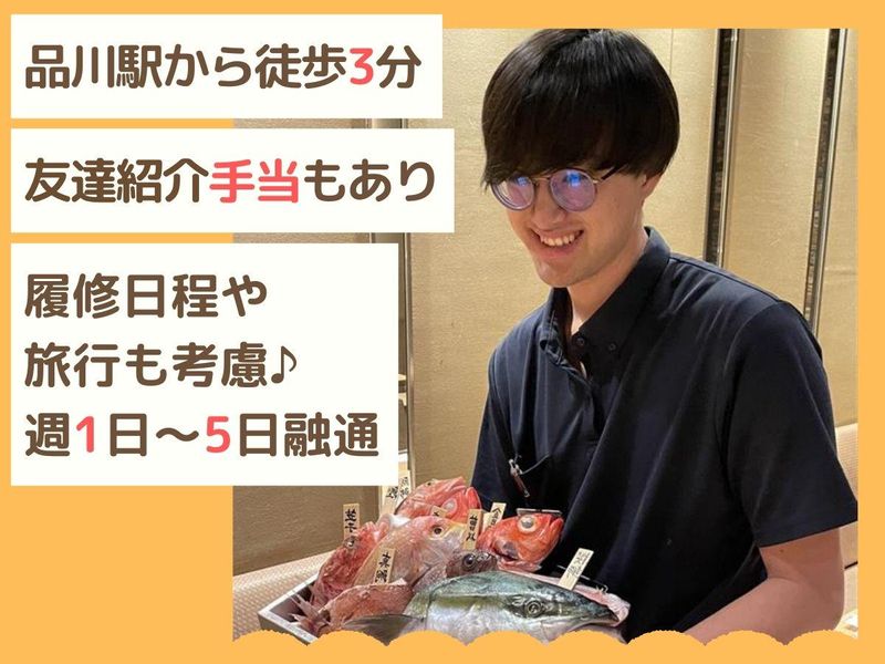仕事内容 。・。*。・。*。・。*。・。*。・。*。・。*。・。 【品川駅3分】未経験でも時給1400円 カウンターに並ぶ豊洲直送の海鮮と 日本酒を楽しめる<海鮮居酒屋> 。・。*。・。*。・。*。・。*。・。*。・。*。・。 【お仕事内容】 簡単♪お席でのQRコード注文方式! ホール業務をメインに、 できる方には簡単な調理補助もお任せ! 休憩中には、板前さん自慢の "美味しいまかない"も楽しめますよ♪ 《具体的には…》 ✅笑顔でお出迎え・お席へのご案内 ✅日替わりメニューのご紹介 ✅BARカウンターでのドリンク作成 ✅コース料理の提供・テーブル状況の確認 ✅調理場のお手伝い(簡単な盛り付けなど) ◎注文は「QRコード式」でミスなし! ハンディ操作が苦手な方も安心です。 *ー・ー*ー・ー*ー・ー*ー・ー* ⏩発注や売上管理といった業務は、 社員さんやベテランの先輩が担当! 日本酒などの知識は無くても大丈夫! ⏩接客未経験者が9割以上! 30代の店長ほか20代中心で、 副業さん・学生さんも多数活躍! 声を掛け合う環境なので、 困ってもすぐフォローしに行きます♪ ⏩履歴書不要ですぐ面接も可能! シフトは時間割やサークル日程なども考慮◎