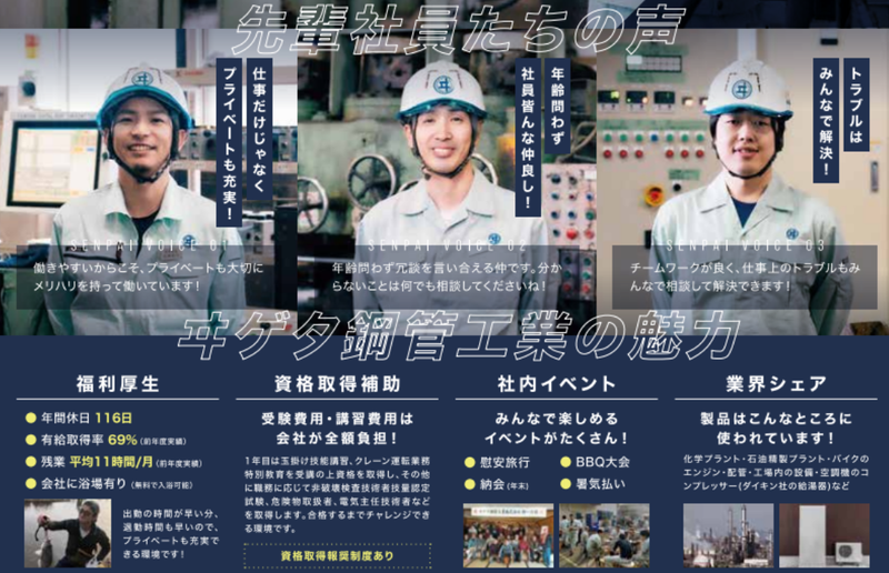 仕事内容 *‥‥*‥ アピールポイント ‥*‥‥* ✨完全週休2日&年間休日117日~♪ ✨有給取得率は前年度実績70%♪ ✨昨年度賞与実績4.4か月分♪ ✨終業時間は16:30♪ └余暇の時間がゆっくりとれます! ✨安定インフラ製品×大手企業との取引 のため景気に左右されない♪ *‥‥*‥‥*‥‥*‥‥*‥‥*‥‥* ┏──────────────────┓ 「手に職をつけたいけど、不安…」 そんなあなたを、私たちが支えます。 今活躍している先輩も、 元営業や元飲食店員など、 未経験スタートが多数。 まずは「挨拶」から始めましょう! ┗──────────────────┛ ⭐具体的なお仕事  ̄ ̄V ̄ ̄ ̄ ̄ ̄ ̄ ̄ ̄ ̄ ̄ ̄ ̄ ̄ ̄ ̄ ̄ ̄ まずは簡単なサポート業務からスタート。 少しずつ機械の操作を覚えていただきます。 鋼管製造の工程の中で様々な職場が あります。 ✅熱処理:加熱炉を操作し材料を 軟らかくしたり、表面を美しく 仕上げたりします。 ✅抽伸:10m以上ある大きな機械を 操作し、鋼管を0.1㎜単位の 精密な寸法に加工します。 ✅検査:完成した製品のキズや寸法を チェック。丁寧に梱包します。 業務の流れ ─────────── 1日の始まりは、朝のミーティングから。 その後、作業開始。 指示された製品の加工作業を行い、 合間に休憩を挟みます。 ※お昼休みのほか、午前・午後に小休憩あり 最初は先輩の横に付き、道具の名前を 覚えることから始めるので、 未経験の方もご安心ください。 ⭐ 教育体制 ─────────── 入社して最初の3ヶ月は、 教育担当の先輩が常に隣にいます。 「これ、どうやるんですか?」と 何度聞いても大丈夫。 1年後には、 一人で機械を操作できるようになることを 目標に、あなたのペースに合わせて 教育を進めます。 ⭐ キャリアアップ ───────────── ゆくゆくは製造の全工程を マスターするだけではなく、技能検定などの 国家資格の取得を目指してください。 もちろん、資格を取得する際は会社が バックアップします。 一生モノの技術を身に付けながら、 現場の核となる存在へと成長していける 環境です。 ⭐ 採用担当からメッセージ ───────────── 「安定した会社で、正社員として長く 働きたい」という気持ちだけで十分です。 創業から80年以上にわたって、私たちは 人を育てることを大切にしてきました。 失敗しても大丈夫。 みんなでフォローする文化があるので、 安心して飛び込んできてください! ─────【当社について】───── ヰゲタ鋼管工業は、1943年創業。 私たちが作る鋼管は、エアコンの冷媒管や 発電所の熱交換器など、身近な場所で 欠かせない存在です。 大手メーカー様から直接指名をいただける 高い技術力を、あなたに伝承したいと 考えています。