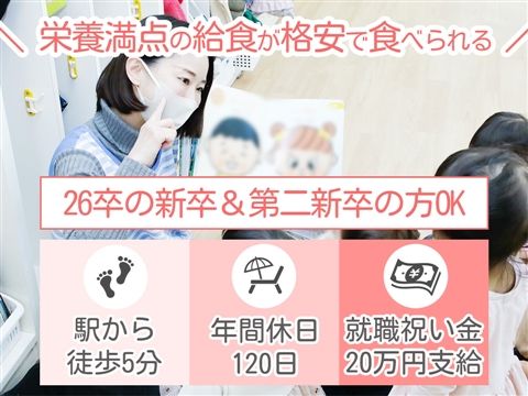 26卒の新卒&第二新卒の方OK◆栄養満点の給食が格安で食べられます★就職祝い金20万円を支給☆月給22万8506円~34万9365円◎年間休日120日☆駅徒歩5分♪【品川区南品川・認可保育園・新馬場駅・保育士・正職員】