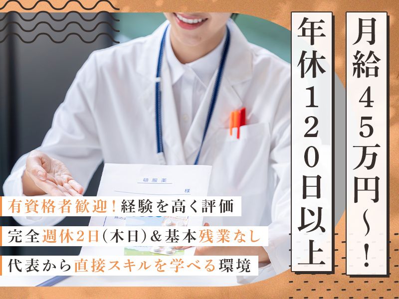 アピールポイント \①経験を正当に評価する給与体系/ あなたのこれまでの経験やスキルを 最大限に評価し、月給45~55万円という 高い給与水準でお迎えします。 業績に応じた賞与も年2回支給しており、 安定した収入基盤のもと、長くキャリアを 築いていける環境です。 \②プライベートを大切にできる休日休暇/ 「仕事と私生活、どちらも充実させたい」 という思いを応援します。 木曜・日曜休みの完全週休2日制で、 祝日を含めて年間休日120日以上を確保! 夏季・年末年始には長期休暇も取得可能です。 残業もほとんどなく、心身ともに ゆとりを持って働けます。 \③業界のプロから直接学び、成長可能な環境/ 代表は、業界歴35年・30店舗以上の薬局立ち上げ 実績を持つベテラン薬剤師です。 「技術力と知識を持った集団をつくりたい」 という目標を掲げ、次世代の育成に注力しています。 新しい薬局だからこそ、代表との距離も近く、 何でも話せる雰囲気です。 豊富なノウハウを吸収しながら、 一流の薬剤師へと成長していきましょう!