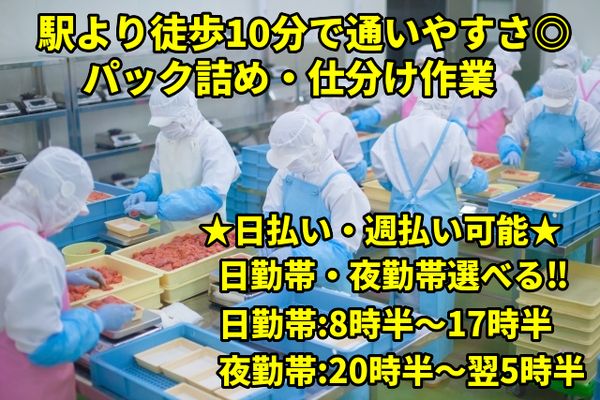 仕事内容 作業はパック詰め作業とパック詰めされた商品を仕分け作業をお願いします。 【パック詰め作業】 パック詰め作業は決められた数量を図り、袋に入れる作業となります。 扱っているものはお肉やお魚となり、 お肉はボウルでお肉を計っていただき、 お魚については何切れなど指定があるので、 枚数を数えて袋に入れていくお仕事となります。 :+:・-・:+:・-・:+:・-・:+:・-・:+:・-・:+: パック詰めが終わった商品は行き先ごとに仕分けていきます。 【仕分け作業】 パック詰めが終わった商品を行先ごとに紙の注文書がありますので、 記載のある数量を行先ごとに場所を書いてる商品置き場があるので、 そちらに振り分けていっていただくお仕事となります。 行き先は主に関東~東北にかけてとなります。 ※作業現場内は平均10℃前後の温度帯となります。 :+:・-・:+:・-・:+:・-・:+:・-・:+:・-・:+: 工場の合併により現在人手が不足中です。。。是非お力をお貸しください!! 見学は随時行っておりますので、いきなりの就業は不安だと思いますので、 まずは現場を見ていただき作業内容や周辺の環境などをわかっていただければと思います。 ご就業まで専任のサポートがご対応させていただきますので、 不安な点や疑問点はいつでもご相談下さい! :+:・-・:+:・-・:+:・-・:+:・-・:+:・-・:+: