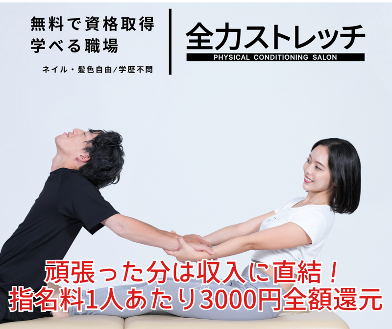 求めている人材 ⭐こんな方にオススメ⭐ ・接客のプロとしてコミュニケーション力や気配りスキルを活かしたい方 ・「美」に関わる仕事がしたい方 ・「本格ストレッチ」に関心がある方 ・コミュニケーションを取るのが好きな方 ・夢や目標がある方 ・未経験者歓迎 ・同業界の経験者歓迎 ・無資格OK ・接客業のブランクOK ・副業・WワークOK ・学歴不問 ・フリーター歓迎! <異業種・異職種からの転職者多数在籍> こんな経験をしてきた方は経験を活かせますよ ・ヨガ、ピラティスのインストラクター、パーソナルトレーナー、スポーツジム受付、ダンサーなど体を動かすお仕事 ・各種ナイトワーク(クラブ、ラウンジ、キャバクラ、バー、スナックなど)のフロアスタッフ、ホールスタッフ、カウンターレディ経験ある方 ・美容部員、アパレル販売員、コンビニ店員、飲食店店員、カラオケ店員などの接客のお仕事 ========== ✅現スタッフを紹介! <20代女性:前職飲食業> 入社動機は「自分が頑張った分はしっかり収入に還元される環境で稼いでみたい!」でした。 指名料によるインセンティブはモチベーションに繋がっています。 <30代女性:前職保険営業> 趣味でダンスをしていたこともあり、次のキャリアを目指す上で体を動かす仕事がしたいと思っていました。 日々お客様に丁寧に向き合うことで、自分の経験値がしっかりと上がってきているのを感じています。 <全国の全力スタッフにインタビュー> ▶「全力ストレッチ」で働く魅力は?  ̄ ̄ ̄ ̄ ̄ ̄ ̄ ̄ ̄ ̄ ̄ ̄ ̄ ̄ ̄ ̄ ̄ ・業界内1の高給 ・頑張りがお給料にしっかり反映される ・「元気をもらいに来たよ」「これからも体を任せたい」とお客様に言ってもらえる ・早くからキャリアアップができる ・好きなものにお金を使える ・自分に自信が持てるようになる ・自分の体のケアができるようになる ・シフト自由でプライベートも充実できる ・様々な人と出会えて人脈が広がる 企業理念「スタッフの生活と心を豊かに」が体現されていて、私たち現場トレーナーを1番に大切にしてくれる会社だと日々感じています。