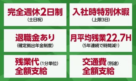 【保険制度】 雇用保険、労災保険、健康保険、厚生年金 待遇・福利厚生 【福利厚生】 昇給あり 交通費全額支給 残業代(1分単位)全額支給 手当※赴任、通勤、資格…最大3.5万円 退職金(確定拠出年金制度)あり 社員寮(実質ゼロ円※引越費用会社負担)…規定あり 永年勤続表彰制度 財形貯蓄制度 上乗せ労災保険あり 総合福祉団体定期保険 健康保険組合・労働組合(ユニオンショップ協定)あり ※組合から 結婚・出産・就学・銀婚祝金ほか 福利厚生サービス「ベネフィット・ステーション」 ◆他制度多数 研修制度あり 資格取得支援 産休・育休 社内クラブ・サークルサポート 安全大会の実施 紹介キャンペーン ◆2020年福利厚生表彰・認証制度「優良福利厚生法人※総合」に選定 ◆自動車通勤OKについて…就業場所の駐車場有無による