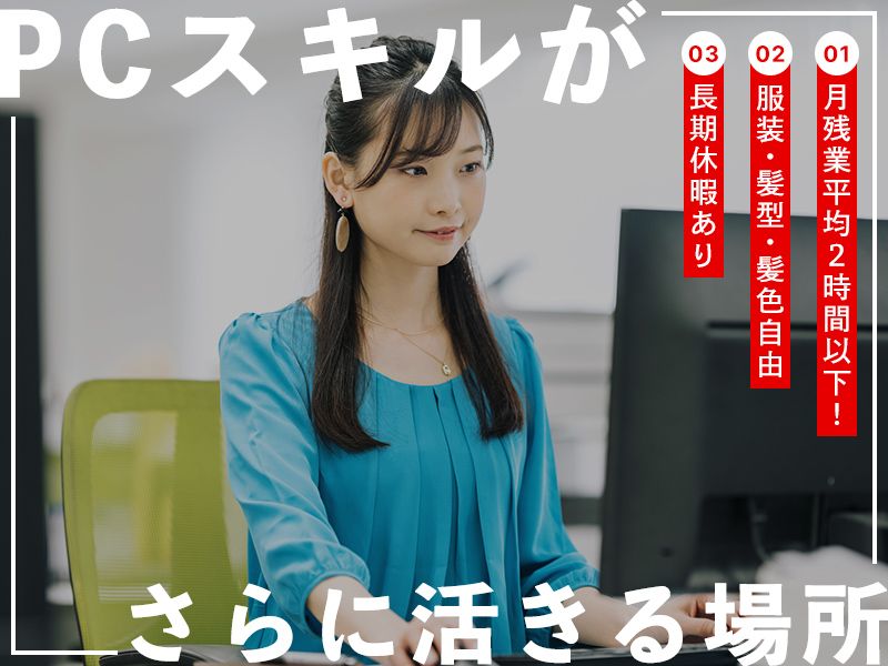 アピールポイント ✅ おしゃれも楽しめる職場! 事務職ですが、制服はありません。 髪型・髪色・ピアスも自由なので、あなたらしいスタイルのまま働けます。 ✅ 働きやすさ抜群! 日曜固定休み&長期休暇(GW・夏季・年末年始)あり。 30代~40代の女性メインで在籍しており、働きやすい環境です!