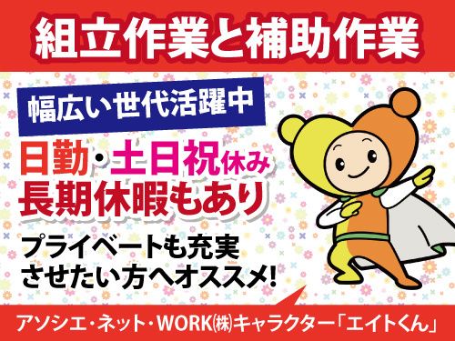 職種補足 【組立・補助作業】電動ドライバーを使ってのネジ締め等 雇用形態 派遣社員 学歴 学歴不問 面接会のお知らせ 【会場】北上市さくらホールfeat.ツガワ(レッスンルーム1) 【開催】11月27日(木)、12月5日(金)、12月12日(金) 【時間】12:00~15:00 備考 私達は“セカンドキャリア”を一緒に切り開く企業です! 今まで培ってきたスキル・ノウハウを当社で活かしてみませんか? 他にも魅力的なお仕事をたくさんご用意しています! 下記URLよりぜひご覧ください! <URL> https://entori.jp/associe-kitakami お問い合わせ先 アソシエ・ネット・WORK株式会社 〒024-0061 岩手県北上市大通り3-1-1 jtsビル3F TEL:0120-3575-88 管理NO 286-4 社会保険 健康保険あり,厚生年金あり,雇用保険あり,労災保険あり 試用期間 あり 時給1,280円 試用期間14日間あり(同条件) 喫煙環境 屋内禁煙 担当者 採用担当 受付先名 アソシエ・ネット・WORK株式会社 〒024-0061 岩手県北上市大通り3-1-1 jtsビル3F TEL:0120-3575-88