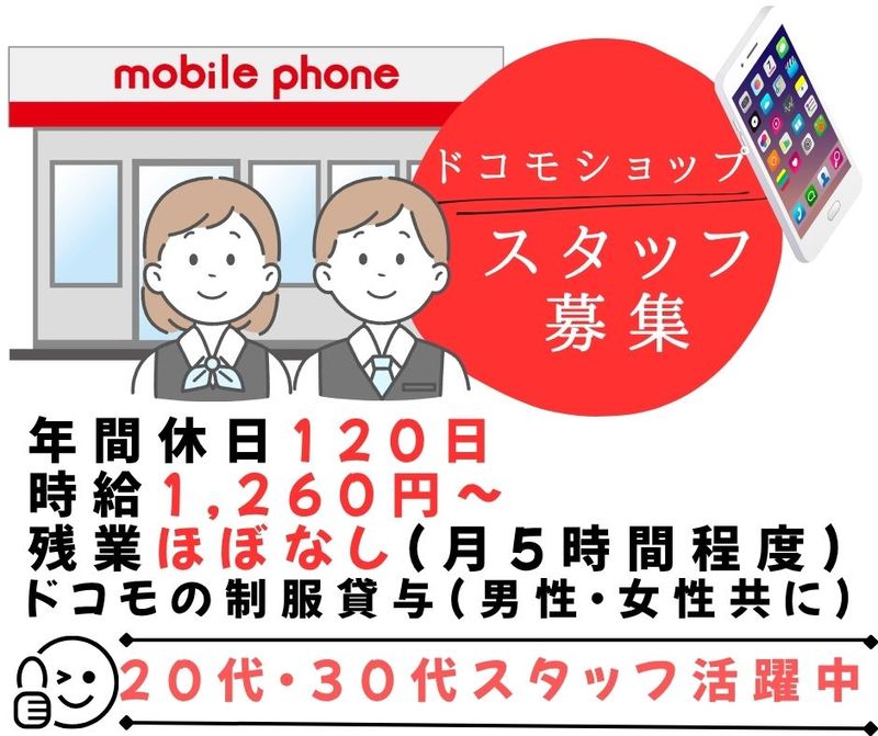 仕事内容 携帯販売店での 携帯・スマートフォンのアドバイス 機種やプランの説明 契約や解約の手続きなどの各種案内 販促企画などをお任せします 季節ごとに店舗のディスプレイを変えたり 商品のPOPを工夫してみるなど 販促やキャンペーン企画も 店舗の仲間と共に考えていくことができます 入社後は、 これから案内していくモバイルの 基礎商品知識について 豊富な資料や教材を利用して覚えていきます 基礎知識を学び、 配属後は現場でのOJTがスタートします 店舗に配属後は指導専任のスタッフが付いて マンツーマンで指導するため 安心してスタートすることができます 慣れるまでは先輩社員の隣で 少し慣れてきたら 先輩社員のフォローを受けつつ 接客を覚えていきます 「いくら知識があっても、 顧客とのやり取りは現場でしか学べない」 という理念を持ち、 現場でのフォロー体制は しっかりと整えています スタッフ7名(男性3名・女性4名) お仕事番号/Cok1124-017