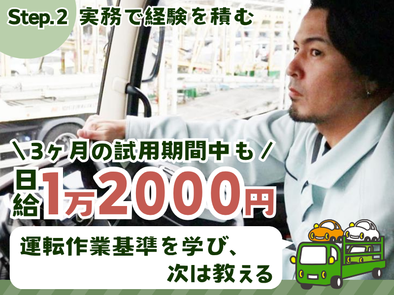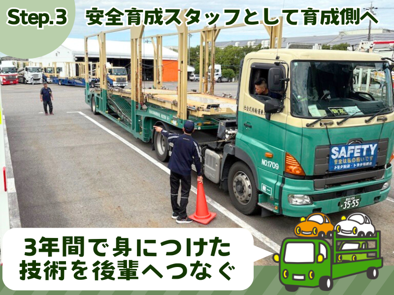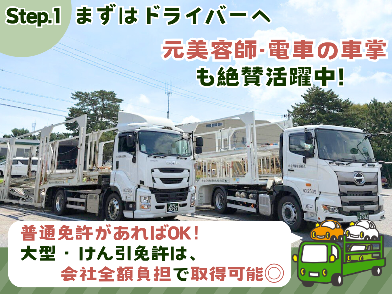 仕事内容 「安全第一」で自ら考えて行動できる (自立・自律した)人材の育成を目指していただきます。 / 未経験からドライバーへ、 そしてその経験を後輩へつなぐ。 \ 免許を活かして「運ぶ人」は増えても、 「技術を教えられる人」は多くはありません。 今回、ドライバーを育成するための、 「安全育成のポジション」を新設しました。 ドライバー未経験の方も歓迎します。 資格取得支援と当社での実務経験を通して、 確実なキャリアアップを目指せます。 ※安全育成スタッフの募集です 【 入社予定日:2027年1月 】 ● 仕事内容  ̄ ̄ ̄ ̄ ̄ ̄ ̄ ̄ ̄ 最初は大型トレーラーで、 車を運ぶお仕事をして頂きます。 3年間は実際の業務で実務経験を積み、 3年間で学んだことを次は安全育成スタッフとして、 後輩の育成に活かしていっていただきます。 ※安全育成スタッフの募集です ▼ 車を運ぶ業務 ▼……………………… ・トヨタの新車などの自動車の輸送 ・車両の積み込み、積み下ろし ・安全運転、点呼の実施 ※重い荷物の積み下ろしはありません ※近距離中心の日帰りエリアのみ <入社後の流れ> ①大型・けん引免許取得 ※入社前 ②入社後研修 ③先輩との同乗を経てトレーラー運転へ ※専門員・現役乗務員のマンツーマン指導 ▼ 後輩の育成業務 ▼…………………… 3年間で身につけた以下のスキルを、 後輩たちに伝えて頂きます。 ✅積み込みの極意の伝授 車種ごとのクセや確実に固定するコツを 実演しながら教えていただきます。 ✅安全の予知を伝授 「この状況は危ない」という、 これまで培った知識や経験を伝えていただきます。 ✅横乗り同乗サポート まずは助手席で運転や作業のポイントを一つひとつ確認しながら、 プロのノウハウを丁寧に伝授いたします。 _/_/_/_/_/_/_/_/_/_/_/_/_/_/_/_/_/_/_/ ⏩異業種からチャレンジした方も活躍中!  ̄ ̄ ̄ ̄ ̄ ̄ ̄ ̄ ̄ ̄ ̄ ̄ ̄ ̄ ̄ ̄ ̄ ̄ ̄ ̄ 前職が”美容師”や”電車の車掌”など 様々な職種から転職してきた先輩がいます! ドライバー未経験の方もご安心ください! ⏩プライベートも充実して働けます!  ̄ ̄ ̄ ̄ ̄ ̄ ̄ ̄ ̄ ̄ ̄ ̄ ̄ ̄ ̄ ̄ ̄ ̄ ̄ ̄ 完全週休2日制(土日)に加えて、 GW・夏季・年末年始には 約8日間の大型連休があります。 旅行や好きなアーティストのライブ、 推し活なども全力で楽しめる環境です。 ⏩毎週火曜は”アイスの日”  ̄ ̄ ̄ ̄ ̄ ̄ ̄ ̄ ̄ ̄ ̄ ̄ ̄ ̄ ̄ ̄ ̄ ̄ ̄ ̄ 夏季期間中の毎週火曜日には、 無料でアイスクリームを支給しています! また、月末にグミやガムなどの配布や、 クリスマスなどにはケーキの配布もあり◎ 気分転換もしながら楽しく働けます! _/_/_/_/_/_/_/_/_/_/_/_/_/_/_/_/_/_/_/ 【 この求人のオススメポイント 】 ■有給休暇平均取得実績18.4日! ■年3回の大型連休あり! ■大型・けん引免許取得制度 (会社全額負担) ■未経験でも安心の丁寧な研修あり! ■体への負担少なめ! 重い荷物の積み下ろしナシ。 ■近距離中心の日帰りエリアのみ! ■転勤なし!無料駐車場完備 ■各種社会保険完備! 専門員・現役乗務員 みんなであなたを支えます! _/_/_/_/_/_/_/_/_/_/_/_/_/_/_/_/_/_/_/ ● 会社見学も実施中  ̄ ̄ ̄ ̄ ̄ ̄ ̄ ̄ ̄ ̄ ̄ 面接の前や、応募前に会社見学も可能! 職場の雰囲気など実際に見てみないと 分からないこともあるかと思いますので、 「面接や応募の前に、一度会社を 自分の目で見ておきたい!」という方も ぜひお気軽にお問合せください! 面接では、お互いを知る時間にしたいと 思っています!堅くなりすぎず、 リラックスしてお越しください◎ 気になることや不安なことなども、 会社見学や面接でお気軽にお聞きください! _/_/_/_/_/_/_/_/_/_/_/_/_/_/_/_/_/_/_/ ⭐ インスタも発信中 ⭐ 先輩や仕事内容など詳細を確認頂けます! https://www.instagram.com /p/C70z9TQprxt/?igsh=YTk4ZXp2MjE0YXU5 ……………………………………………… お電話でのお問い合わせも大歓迎! TEL:0565-53-3081(採用担当まで) ……………………………………………… _/_/_/_/_/_/_/_/_/_/_/_/_/_/_/_/_/_/_/
