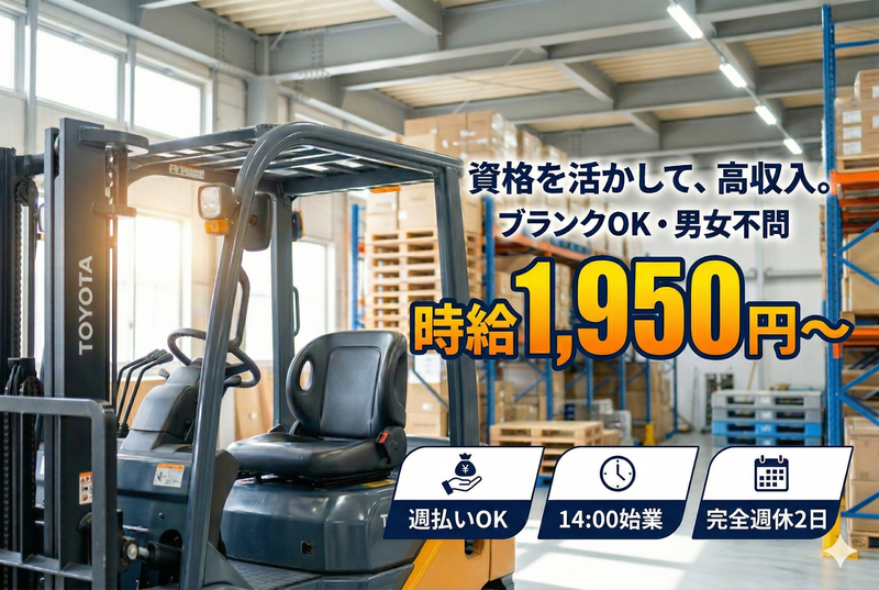 仕事内容 ⭐ブランクOK ━━━━━━━━ ⭐週払いOK(規定) ━━━━━━━━━━ ⭐14時始業で朝はゆっくり ━━━━━━━━━━━━━ ⭐完全週休二日制でメリハリ◎ ━━━━━━━━━━━━━━━ スーパーやドラッグストア向けの 「おせんべい・スナック・チョコレート」 などを扱う常温物流倉庫でのお仕事です。 倉庫内はすべてお菓子商品なので、 身近で親しみやすい商品に囲まれて働けます! (( 具体的には… )) ■入荷商品の格納(フォークリフト使用) ■ピッキングで減った棚への補充 ■出荷前商品の運搬・積み込み フォークリフト作業が中心ですが、 状況に応じて手元作業もあるため 適度に体を動かしながら働ける環境です。 作業の流れもシンプルで覚えやすく、 経験を活かしてすぐに活躍できます! / ここがポイント♪ \ ✅高時給1950円~(入社月含む3ヶ月) ※3ヵ月経過後/時給1650円~ ✅週払いも相談OK! 急な出費がある際も安心です♪ ✅完全週休二日制でしっかり休める! 日曜+他1日、相談OK◎